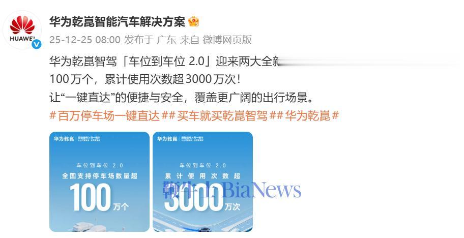 今日,华为乾崑智能汽车解决方案官方发文宣布,华为乾崑智驾「车位到车位2.0」迎来两大全新里程碑:全国支持停车场数量突破100万个,累计使用次数超3000万次。