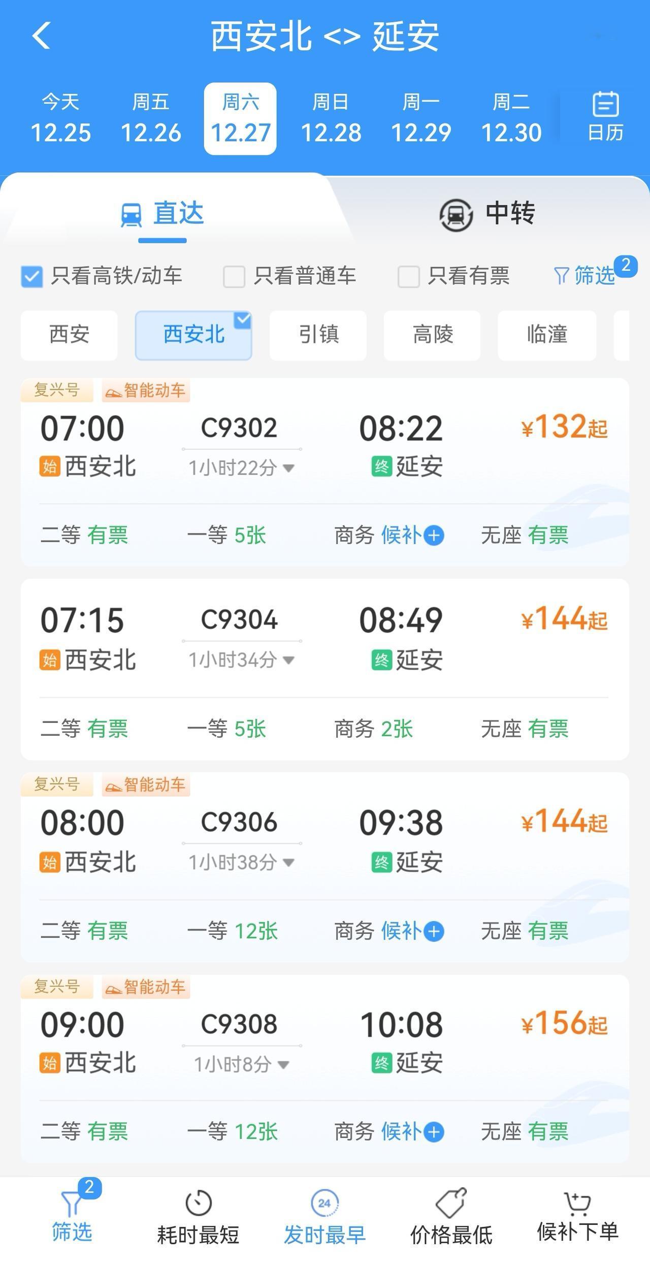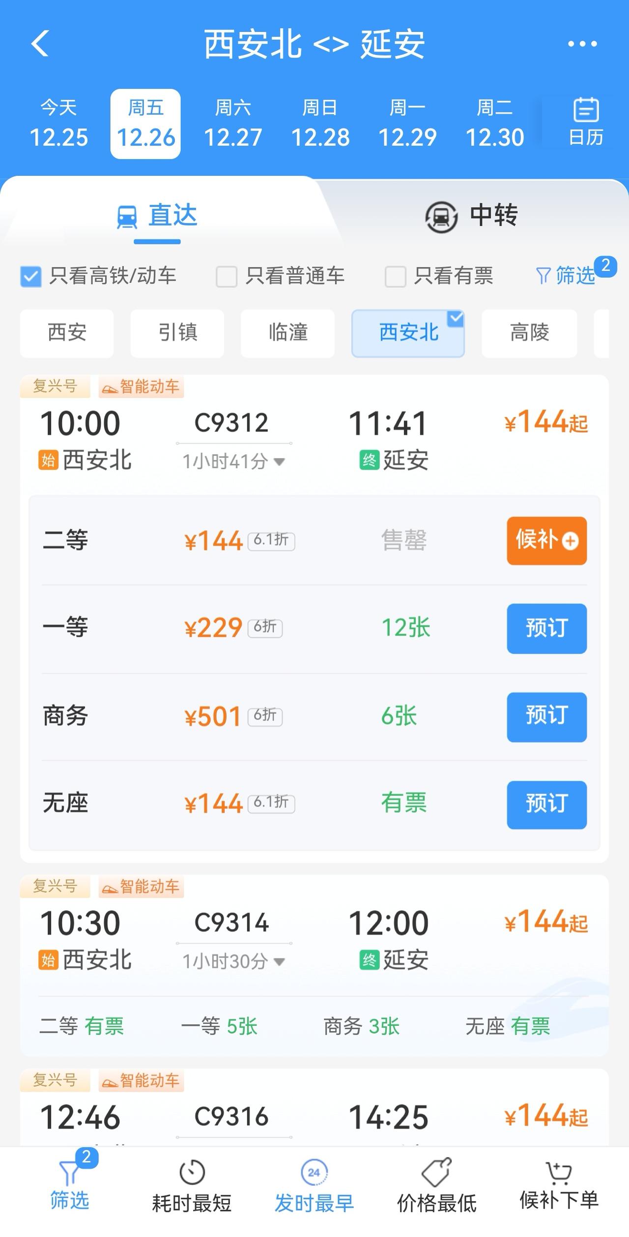 西延高铁票价公布,线路执行浮动折扣优惠,二等座车票价格介于132-156元区间,折扣幅度在5.6-6.6折。根据铁路12306显示,12月26日10时由西安北站始发的C9312首发列车二等座已售罄。