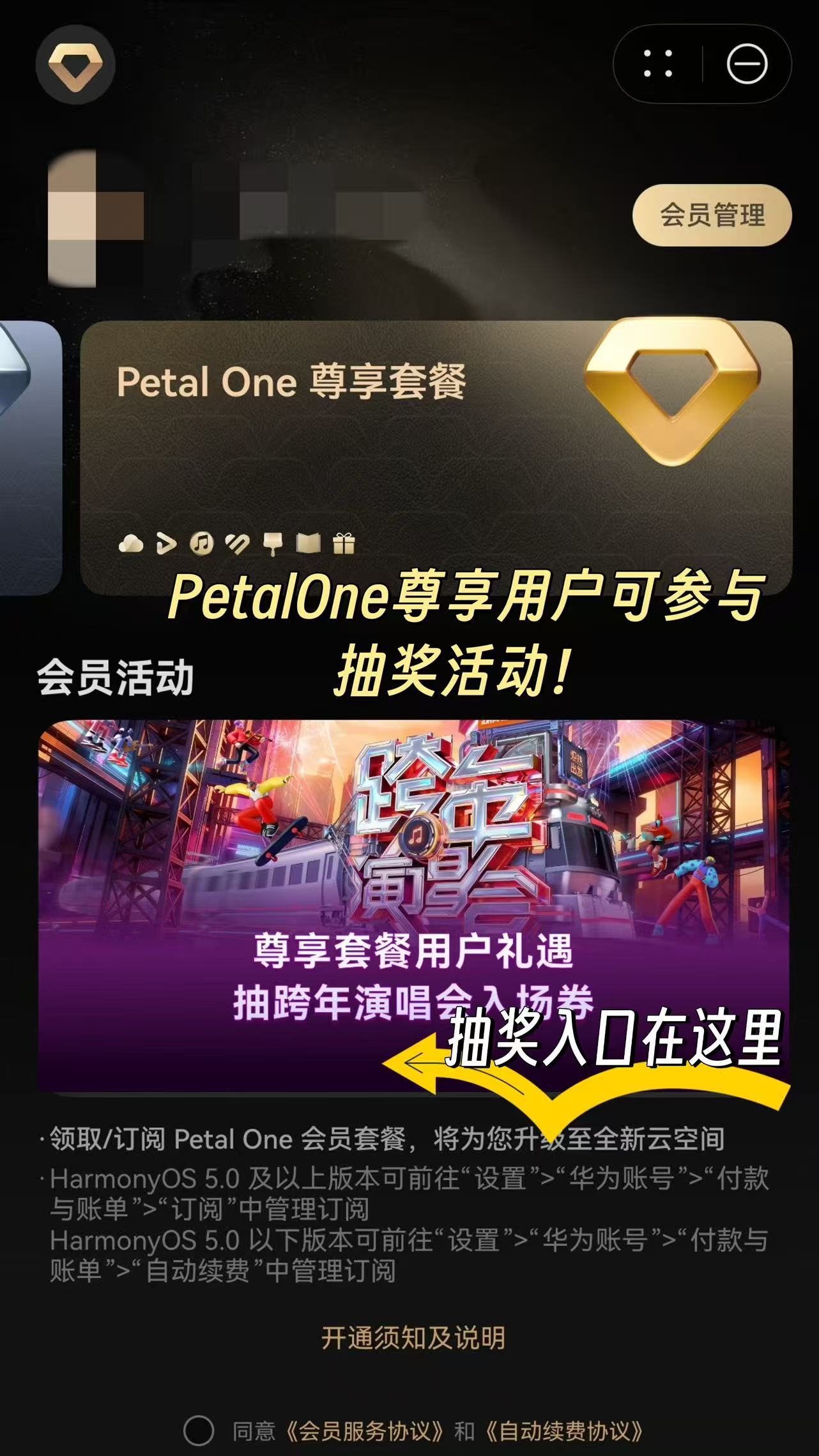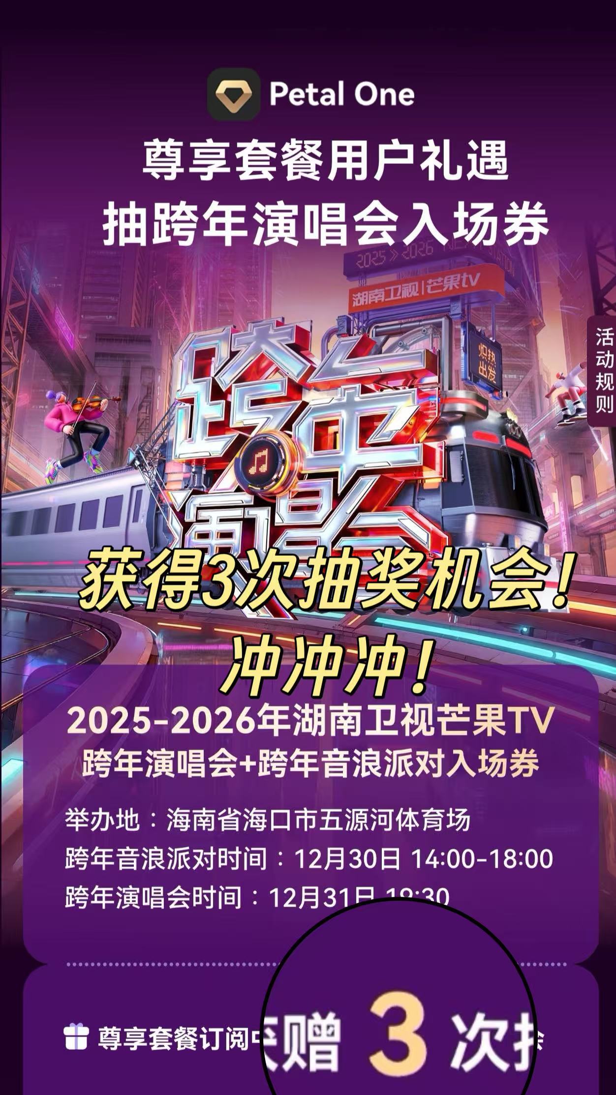 湖南卫视跨年演唱会 湖南卫视芒果TV跨年演唱会入场券免费抽!华为Petal One会员专属福利太顶了~【2025-2026湖南卫视芒果TV跨年演唱会】前两波阵容已官宣,顶流明星云集,也太让人期待了,谁不想亲临现场跨年呀~好消息来啦!PetalOne 尊享套餐订阅中用户直接解锁 3 次抽奖机会,入场券免费抽!新用户订阅套餐还送影视年卡大礼包,华为视频 + 优酷双平台一年会员直接拿捏!8 大核心权益 + 2 项限量礼遇,2TB 云空间、海量热剧好歌随心享~华为手机鸿蒙 5.1及以上用户,负一屏搜 Petal One 或大会员就能找到活动入口!升级后一定要去负一屏参与鸿蒙有礼 ,免费领超多实用会员,活动进入倒计时,赶紧去参加!