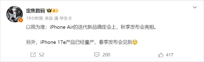 除了曝光iPhoneAir2的消息外,@数码定焦还表示称iPhone17e预计将在苹果春季新品发布会上亮相,该发布会一般在每年3月举行。