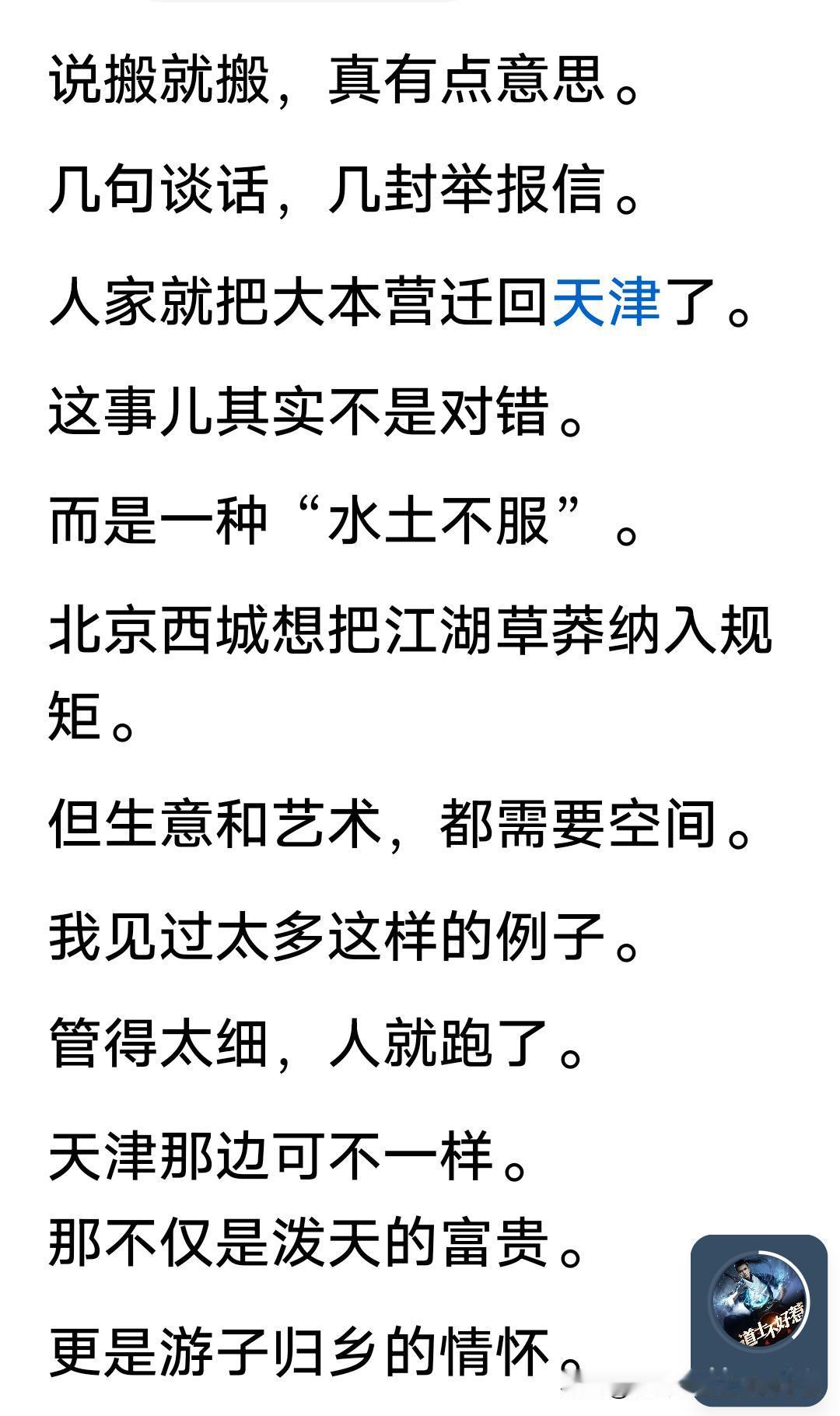 相声本来就是草根文化,是曾经的天桥把式,是民间喜闻乐见的文娱形式。你如果强行拔高到一定程度,把里边装满冠冕堂皇,吹吹捧捧,歌舞升平,那就失了本心,没了地气。就会像京剧,甚至那个什么剧,秀才都得捧着书本听戏,累不累,有什么意思。所以郭德纲让相声来自于民间,服务于民间,扎根于民间,生养于民间的思路是对的。人家用国家财政养着,依然赚的盆满钵满,不像吃财政的某协,某局,不思扶持发展,步步设限,处处罚款,设心处虑,只想分杯羹吃,如果上缴国库,纳税能理解,但如果以罚代管,不思合作指导呢?也许离开就是无声的抗议。郭德纲文化梗 相声文化