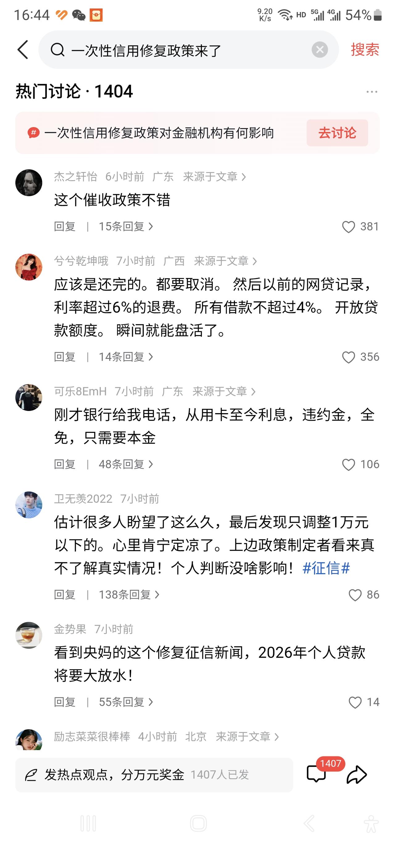 媒体报道比较正式,通俗给大家讲一下: 一、只要在文件制定期限内还钱,不需要你任何申请和操作,不需要提供任何材料,银行就给你处理了。 这个政策没有任何费用,不要相信第三方。 二、征信信息显示也不需要你申请和操作,银行给你处理。想了解到底去掉逾期信息没有,手机网上银行查询征信报告就行。 三、个人观点非解读,既然已经出台了这样的政策,金额不超过1万元是不是太低了,放高点不是更容易促进还款吗? 一次性信用修复政策会带来哪些影响
