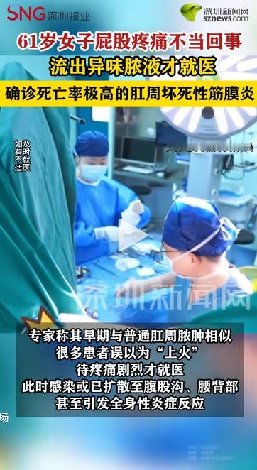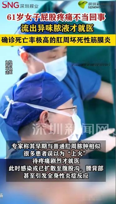 “悲剧还是发生了!”近日,湖南长沙,一女子屁股疼,本以为是得了痔疮,结果用了十多天的药也没见好转,而且还有令人作呕的脓液流出!女子实在忍不住了,就去医院检查,没想到竟是肛周坏死性筋膜炎,医生:死亡率高达40%! 近日,湖南长沙发生了一起引发网友关注的病例,王大姐(化名)因“屁股疼”这一看似普通的不适,差点酿成严重后果,所幸及时就医,经过治疗后目前已顺利出院,但整个过程仍让人心有余悸。 事情要从前段时间说起,王大姐起初只是感觉臀部隐隐作痛,并伴有轻微不适,由于疼痛并不剧烈,她并未放在心上,以为就是最近天气太干喝水少导致的“上火”,于是通过多喝水、清淡饮食来缓解,几天后,疼痛不仅没有消失,反而逐渐加重,坐立不安,局部还有明显的肿胀感。 随着症状进一步发展,王大姐开始怀疑自己得了痔疮,毕竟在很多人的认知中,肛周疼痛、肿胀往往与痔疮有关,于是她自行购买了外用和口服药物进行治疗,连续用了十多天。 然而,情况并未好转,疼痛反而更加明显,局部还开始渗出带有异味的脓性分泌物,这一变化让她感到不安和恐惧。 到了这个阶段,王大姐已经难以正常生活,疼痛影响了睡眠和行动,实在忍无可忍之下,她才前往医院就诊,经过医生详细检查和相关影像学、实验室检查后,结果让她和家人都大吃一惊,并非普通痔疮,而是肛周坏死性筋膜炎。 医生介绍,这是一种进展迅速、危险性极高的感染性疾病,常发生在会阴等部位,一旦延误治疗,感染可迅速扩散,引发全身感染,严重时甚至危及生命,正因如此,医生立即对王大姐采取了针对性的治疗措施,包括抗感染治疗及局部处理,防止病情进一步恶化。 幸运的是,王大姐送医时间尚未错过最佳救治窗口,在医护人员的全力救治下,感染得到了有效控制,病灶逐步好转,经过一段时间的系统治疗和观察,她的身体状况明显改善,最终顺利康复出院。 事件经分享后迅速引发网友热议,不少网友表示震惊,直言“没想到屁股疼也能这么危险”,也有人感慨自己平时遇到类似症状往往选择忍一忍或自行用药,还有网友留言提醒,身体出现异常信号时,切勿盲目判断,更不能讳疾忌医。 医生也借此提醒公众,肛周持续疼痛、肿胀、发热,或伴有脓性分泌物、恶臭等情况,绝不能简单当作痔疮处理,如果症状在短期内加重或用药无效,应尽快前往正规医院检查,以免延误病情,尤其是糖尿病患者、免疫力较低的人群,更要提高警惕。 王大姐的经历给很多人敲响了警钟,看似不起眼的小症状,背后可能隐藏着严重疾病及时就医、科学判断,才是对自己健康负责的正确选择。 信息来源:深圳新闻网
