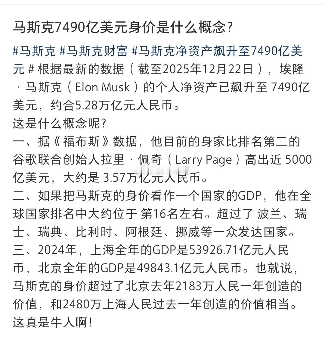 再次刷新纪录!马斯克身家已经达到7,490亿美元,约合5.28万亿元人民币,他