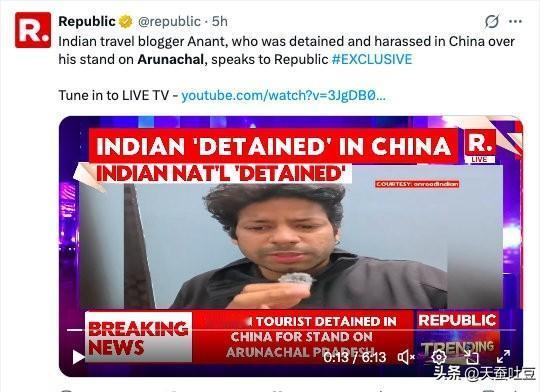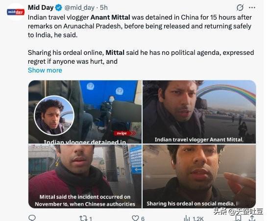 【藏南政情】 昨天,印度媒体正在炒作一名印度博主被我广州机场海关审查事件。据印度媒体称, 改名印度人阿南特·米塔尔(Anant Mittal)是一名旅行博主,运营着YouTube频道“ On Road Indian”,他声称自己于2025年11月16日在广州机场被我相关部门拘留了近15个小时。在返回印度后,米塔尔发视频自称,此次拘留与他此前发布的一段支持伪阿鲁纳恰尔邦是印度不可分割的一部分的视频有关。非常典型的印度阿三心理,碰瓷才能有流量。印度网红上海行 中印藏南争议 印度网民评论 印度博主游中国