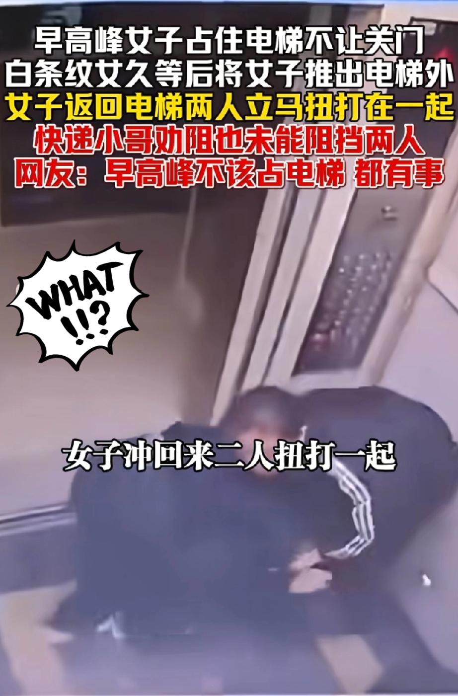 刷到12月24号早高峰的电梯冲突,我直接拍手叫好! 一个女的占着电梯门等人,阻碍大家通行,被同乘者推出电梯后还动手,结果俩人扭打在一起,快递员劝架都没用。 结局大快人心,这女的不仅没占到便宜,还被打得够呛,上班迟到罚200,全勤没了,一天吃不下饭,晚上睡不着觉。(臆想) 早高峰的电梯是公共资源,没准备好就别摁电梯,凭什么让一电梯人等她?那种摁着电梯门,不让走的,真没素质,必须严惩!打得好!就该让她长点记性! 电梯悲剧 电梯伤人 电梯内奇葩事件