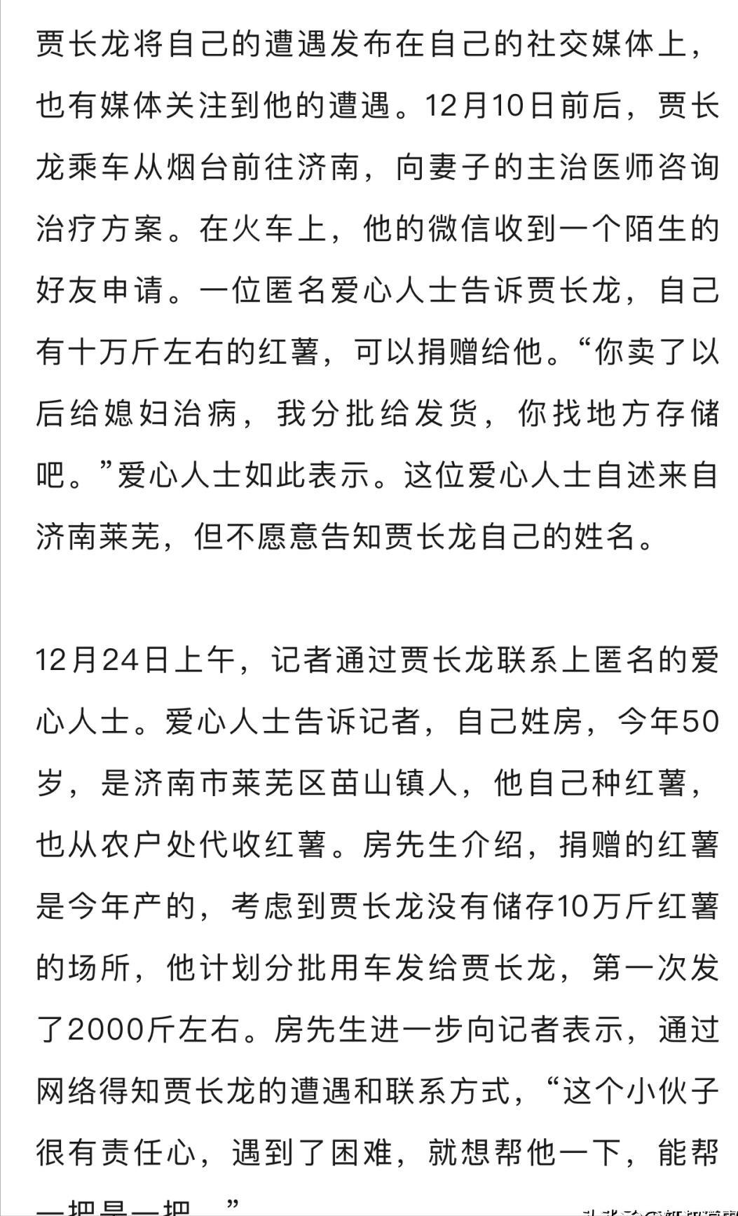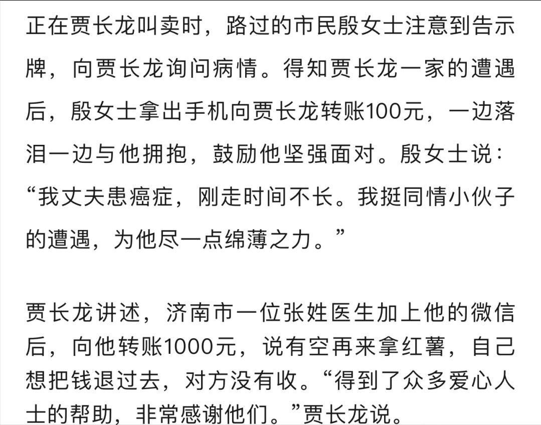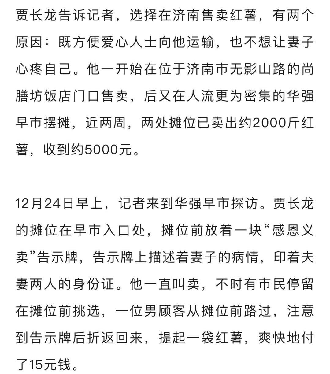 妻子被确诊为急性髓系白血病需200万元,丈夫求助后,有人匿名分批捐红薯,丈夫摆摊售卖:目前已卖2000斤。[嘘] 为了给患白血病的妻子筹集治疗费,济南男子贾长龙在街头摆摊卖起了红薯,这些红薯有些特别,是一位不愿透露姓名的好心人专门捐给他的,总共要捐十万斤。 贾长龙的妻子确诊急性髓系白血病,治疗费用高昂,这位来自莱芜区的捐赠者没有直接给钱,而是选择提供实实在在的红薯,让他自己销售来换钱,目前已经分批送达了一部分,整个捐赠会持续进行。 贾长龙每天早上五点就开始忙碌,他在华强早市把红薯分装成袋,趁着早高峰叫卖,市场管理方知道他的情况后,给他提供了免费摊位,还专门划了块地方让他堆放货物,早市结束后他会转到无影山路的一家饭店门口继续卖。 摆摊大约两周,他已经卖出了两千来斤红薯,相对于两百万的治疗费用,这笔收入还差得很远,但每一分钱都来自他自己的劳动和陌生人的善意,顾客买走一袋红薯,也等于为这个家庭送去了一份支持。 这种帮助的方式很实在,捐赠者既提供了物资,又给了贾长龙一个靠双手努力的机会,他不用只是被动等待救济,而是可以每天为妻子的生命实实在在地做点什么,早市提供的免费摊位,也是社区温暖的一种体现。 现在贾长龙的妻子还在医院接受治疗,街头的红薯摊会一直摆下去,那十万斤红薯意味着这份来自陌生人的支持将持续很长一段时间,这不仅仅是物资,更是一种陪伴和鼓励,告诉这个家庭他们不是在孤军奋战。 面对重大疾病,个体的力量常常很微小,但一点一滴的助力汇聚起来,就能成为走下去的支撑,这种“给物资,助销售”的方式,既解决了部分经济困难,也维护了受助者的尊严和主动性。 这事儿最近在网上传开了,看得人心里暖烘烘的,一个男人为了给妻子筹钱治病,在济南街头卖红薯,而这些红薯是一位素不相识的好心人专门捐给他的,网友们讨论得挺热烈。 “直接给钱,钱花完了压力更大,给这么多红薯,是给了人家一个‘营生’,他每天去卖,虽然辛苦,但每一分钱都是自己劳动挣来的,心里踏实,也能看到希望。” “这就是街坊邻里最朴实的善意,他们可能也做不了惊天动地的大事,但腾个地方、搭把手、帮忙吆喝几声,这些‘举手之劳’聚在一起,就是能托住一个家庭的力量。” “卖两千斤红薯,离两百万医疗费还有多远?想想就让人喘不过气。” “能一下拿出十万斤红薯,这肯定不是一般人,但人家做了好事连名字都不留,是真想帮忙,不是图名。” “他没在镜头前哭诉,也没四处‘卖惨’,就是闷头干活,想办法,这份担当,让人佩服。” “这个捐赠方式真聪明!十万斤红薯,让受助者靠劳动获得收入,比直接给钱更有尊严,捐赠者考虑得很周全,既帮了人,又不让受助者有心理负担。” “早市提供免费摊位,饭店帮忙储存售卖,这才是社区应有的温度,在困难面前,普通人的举手之劳往往能汇聚成巨大力量。” 您如何看待这种"以物代捐"的帮扶方式?如果您在当地,会去购买这样的爱心红薯吗?对于完善大病医疗救助体系,您有什么建议?欢迎在评论区分享您的观点。 信息来源:极目新闻