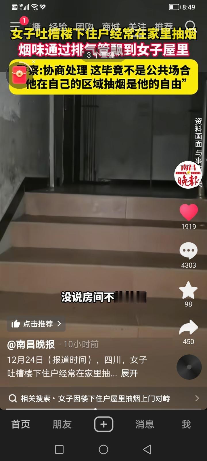 看到一个新闻,一女子早上5点举报楼下邻居在厕所里抽烟,烟味通过排气管吹到她房间了,看到这个都把我逗笑了。她还打电话报警,警察叔叔来了也没用啊,别人在家里抽烟,又不是在公共区域。你受不了烟味,要不去举报开发商,说房子当初没建好。(图片信息来源:南昌晚报)吸烟有害健康为什么还要抽吸烟 吸烟举报 住户异味纠纷 邻居抽烟 家长发现抽烟