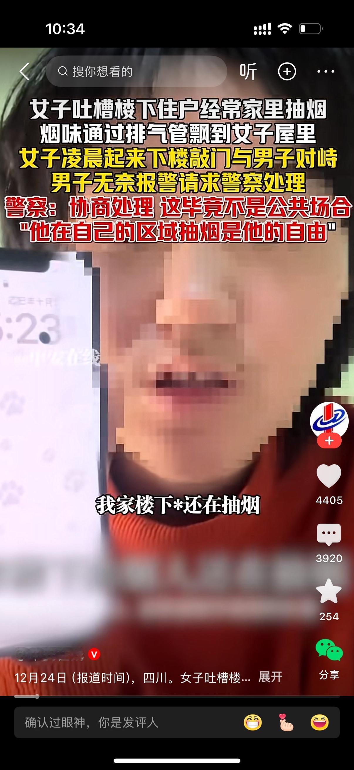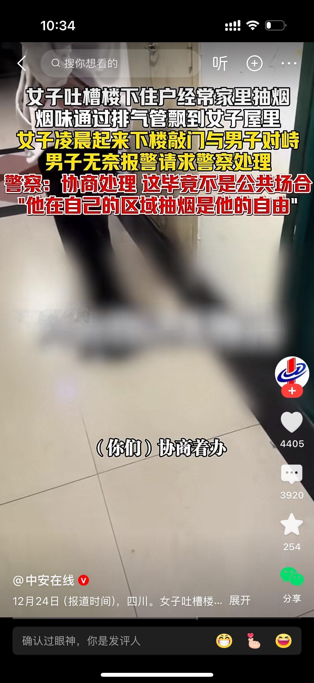 女子吐槽楼下住户经常在家里抽烟。烟味通过排气管飘到女子屋里。女子凌晨起来到楼下敲门与邻居对峙。男子无奈报警请求帽子叔叔处理。帽子叔叔说你们协商处理,毕竟在自己屋里抽烟是他的自由。女子表示不理解,还在纠缠不休。男子说你拉屎熏到我了,我要找你吗?女子无语了。