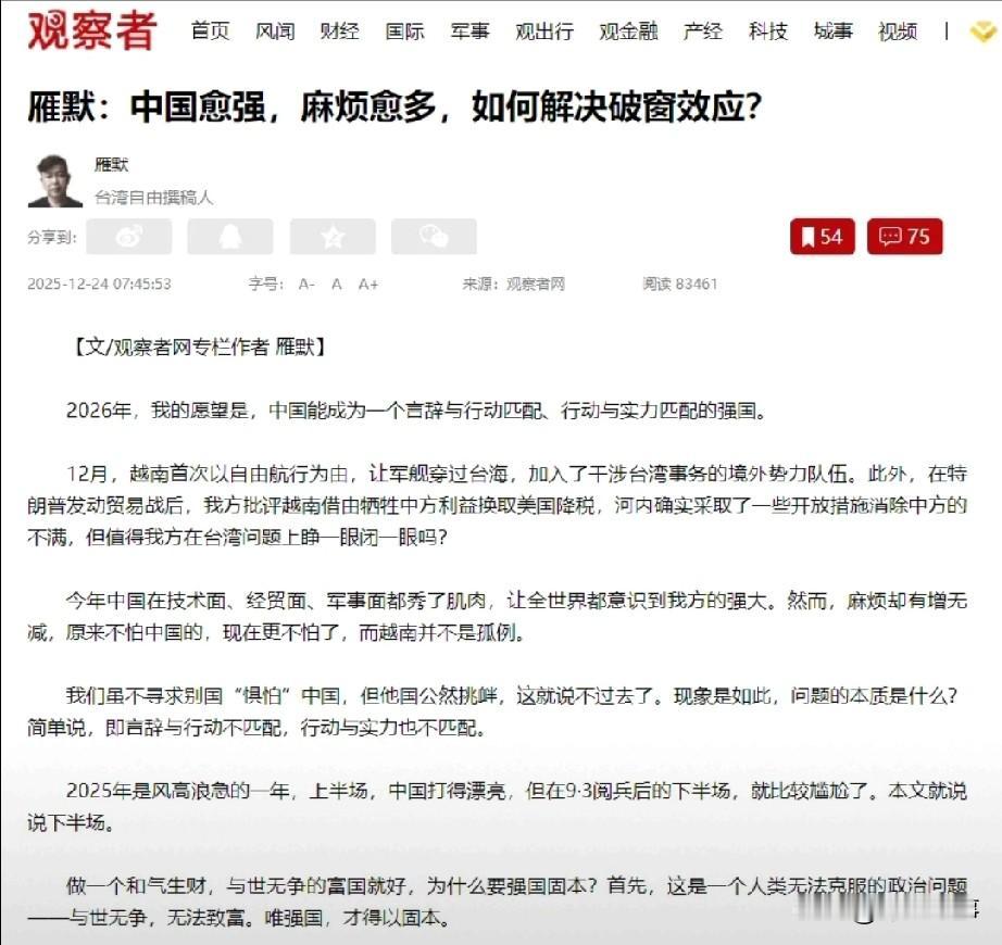 中国发展壮大后周边挑衅增多,并非国强招恨,而是国际博弈中的“破窗效应”所致。 中国近年在科技、经贸、军事领域实力稳步提升,国际影响力持续增强,但个别国家在美国支持下频频挑衅。菲律宾多次非法闯入黄岩岛、仁爱礁海域,拉拢他国搅局南海;日本借机突破和平宪法约束推进军事扩张,在东海、南海滋事。这类国家的底气,源于初期挑衅未得到有力反制,才敢得寸进尺。 历史早已证明,单纯闷头发展经济守不住财富,晚清的教训就是前车之鉴。如今美国动辄对华实施芯片封锁、加征关税,更印证没有强大实力作后盾,发展成果随时可能受损。 破解这一困局,关键是对挑衅行为果断反制。对非法闯海行为,既要依法驱离,也要采取经贸反制措施;对外部势力军事搅局,需强化军事部署,亮明捍卫主权的决心。 国强未必生乱,2025年中印边境保持安稳,正是军力威慑与谈判协商并重的结果。只要坚定维护国家利益,让挑衅者付出代价,就能遏制歪风,为国家发展营造稳定环境。
