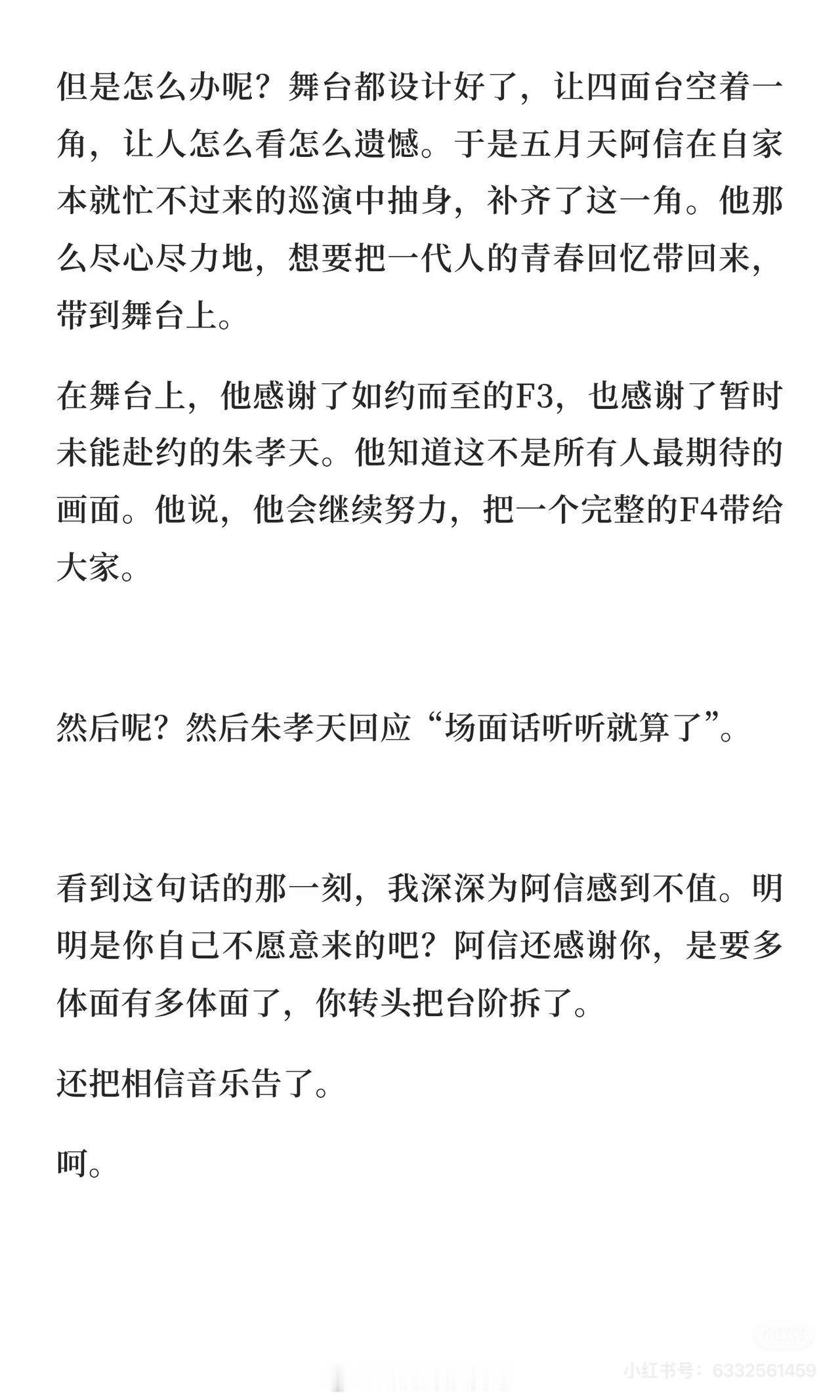 阿信体面 复盘一下阿信这波操作,为了不让四面台空出一角,他牵头补位完成巡演;全程没说过一句负面言论,还两次公开感谢朱孝天,为后续合作留了台阶。成年人处事都讲体面,朱孝天咋就不懂这个理?