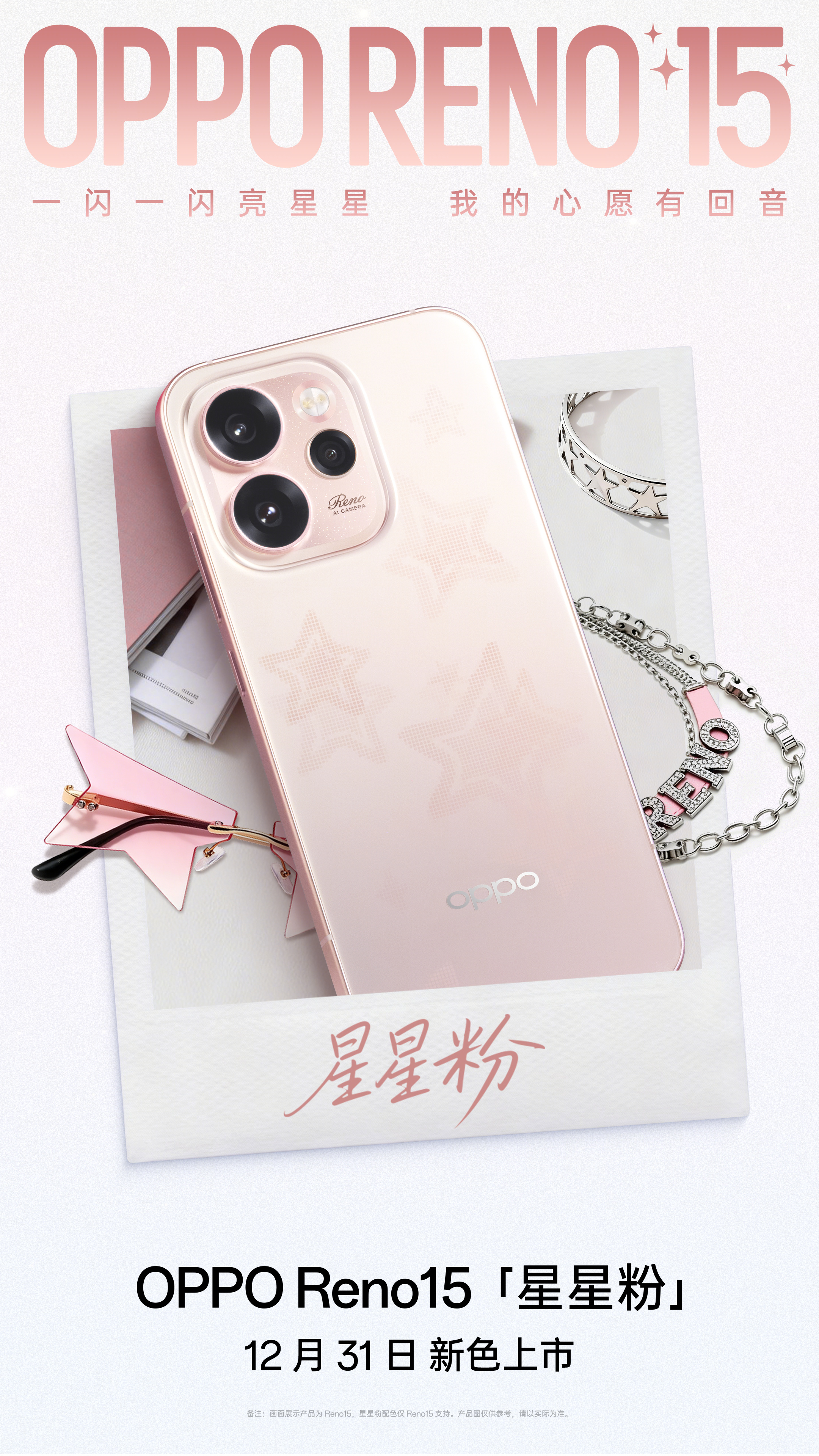 OPPO Reno15 新配色「星星粉」登场,后盖用了星闪光栅工艺,转动起来会有