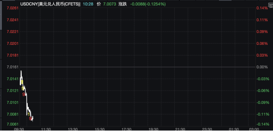 在岸人民币方面,Wind数据显示,截至25日10:28,该市场汇率报7.0073元,较前收盘价上涨88个基点,盘中最高报7.0061元。