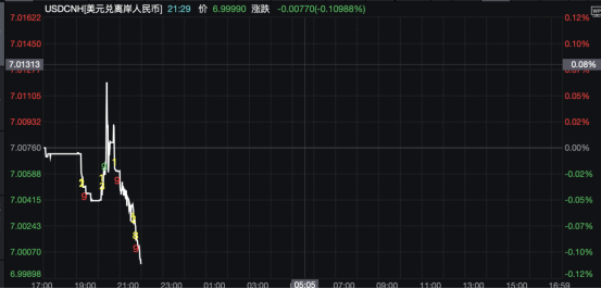 Wind数据显示,截至25日10:29,离岸人民币对美元汇率报6.9999元,较前收盘价上涨77个基点,盘中最高报6.9981元,升破7元关口。