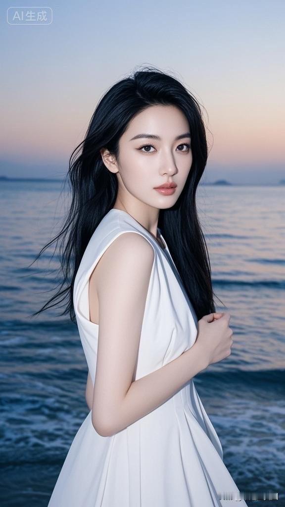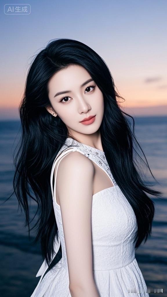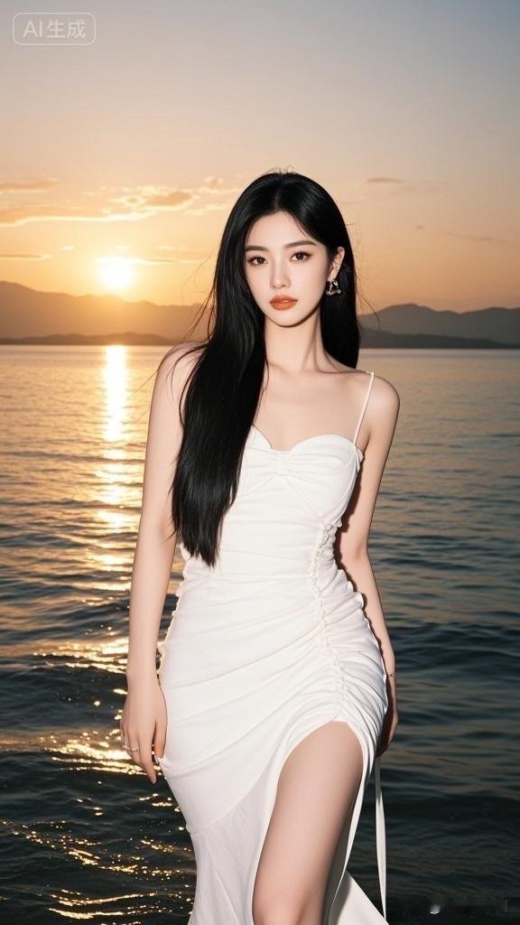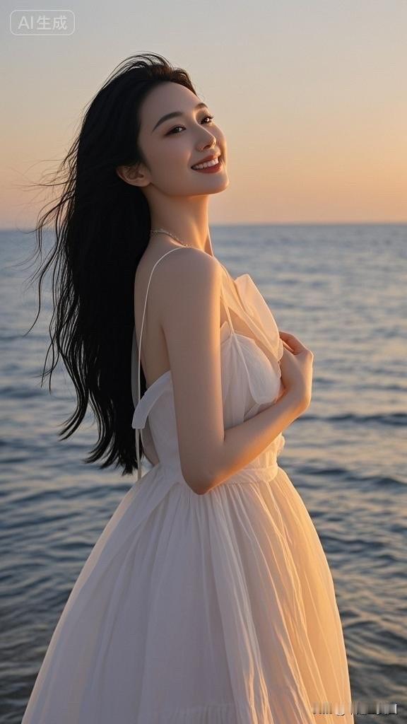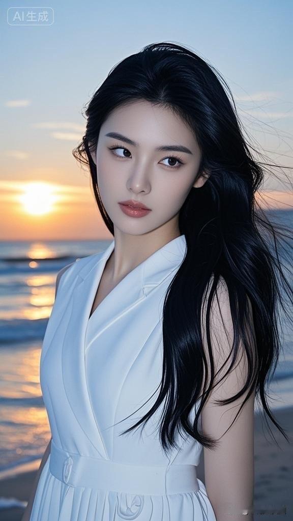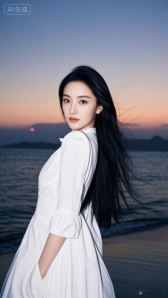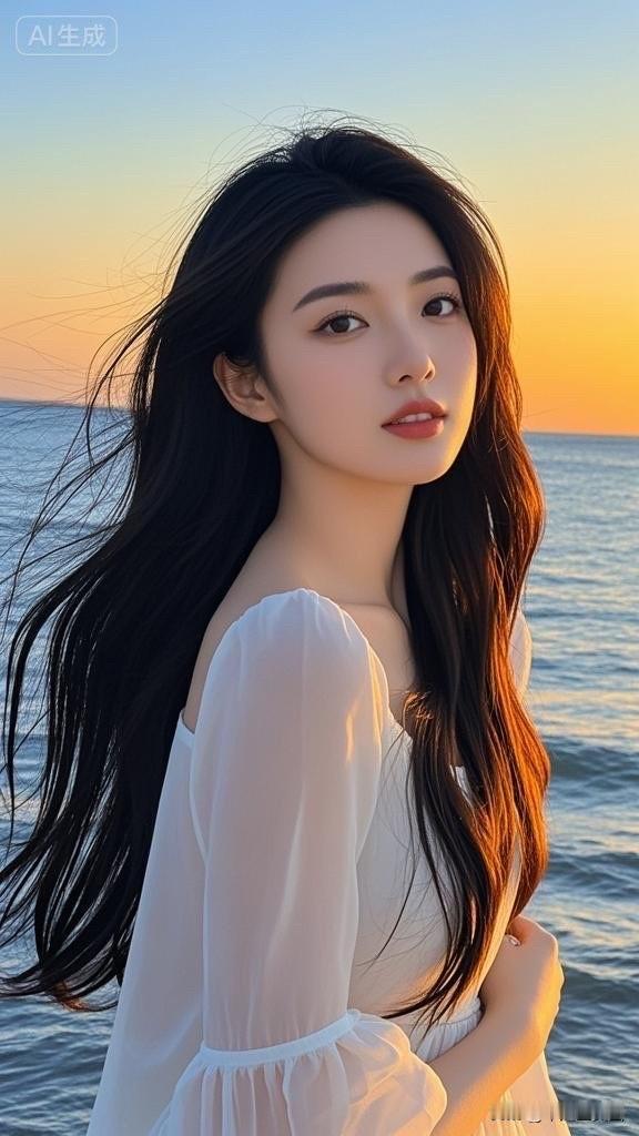海边日落下的温柔少女,白纱裙随风飘扬,美得如梦如幻。