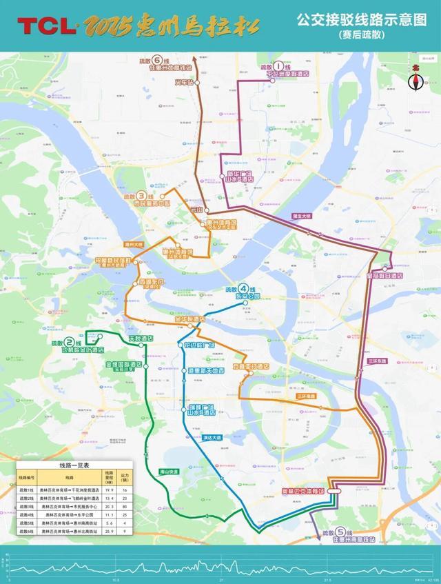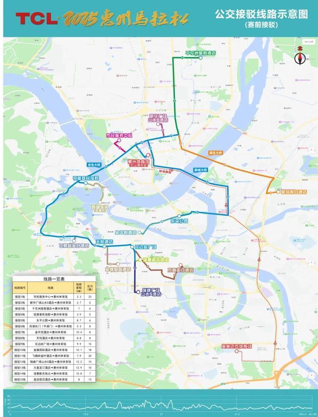 赛事当天清晨,在市区江北、江南、桥东、桥西、龙丰、河南岸、水口七大片区设置15条接驳专线,中途不停靠,一站直达起点惠州体育馆(云山城轨站)。车辆贴有统一标识,请注意识别。