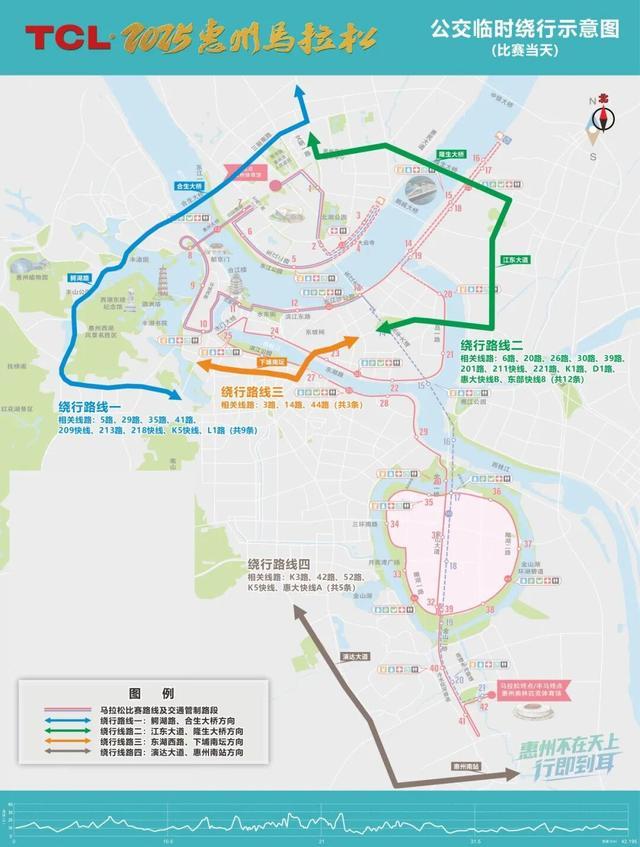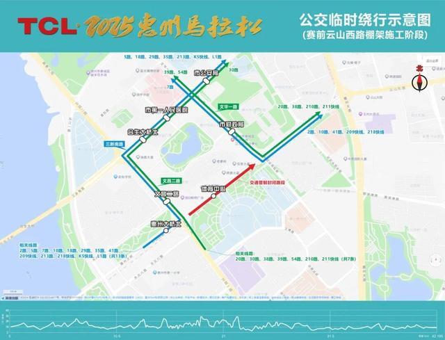 ·绕行:途经环城西路、惠州大桥、东江大桥、水门桥、东湖路、金山大道等路段的线路将绕行。