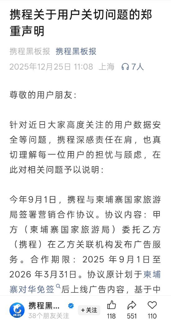 携程表示,今年9月1日,携程与柬埔寨国家旅游局签署营销合作协议。协议内容:甲方(柬埔寨国家旅游局)委托乙方(携程)在乙方关联机构发布广告服务。合作期限:2025年9月1日至2026年3月31日。协议原计划于柬埔寨对华免签后上线广告内容,基于中国驻柬埔寨大使馆近期发布的安全提醒,我司第一时间暂停了原定的投放动作,合作未曾启动。携程承诺:该协议不涉及任何数据合作,绝不存在泄露用户隐私信息的情况,并已将合作协议及实际情况提交相关部门验证核查。
