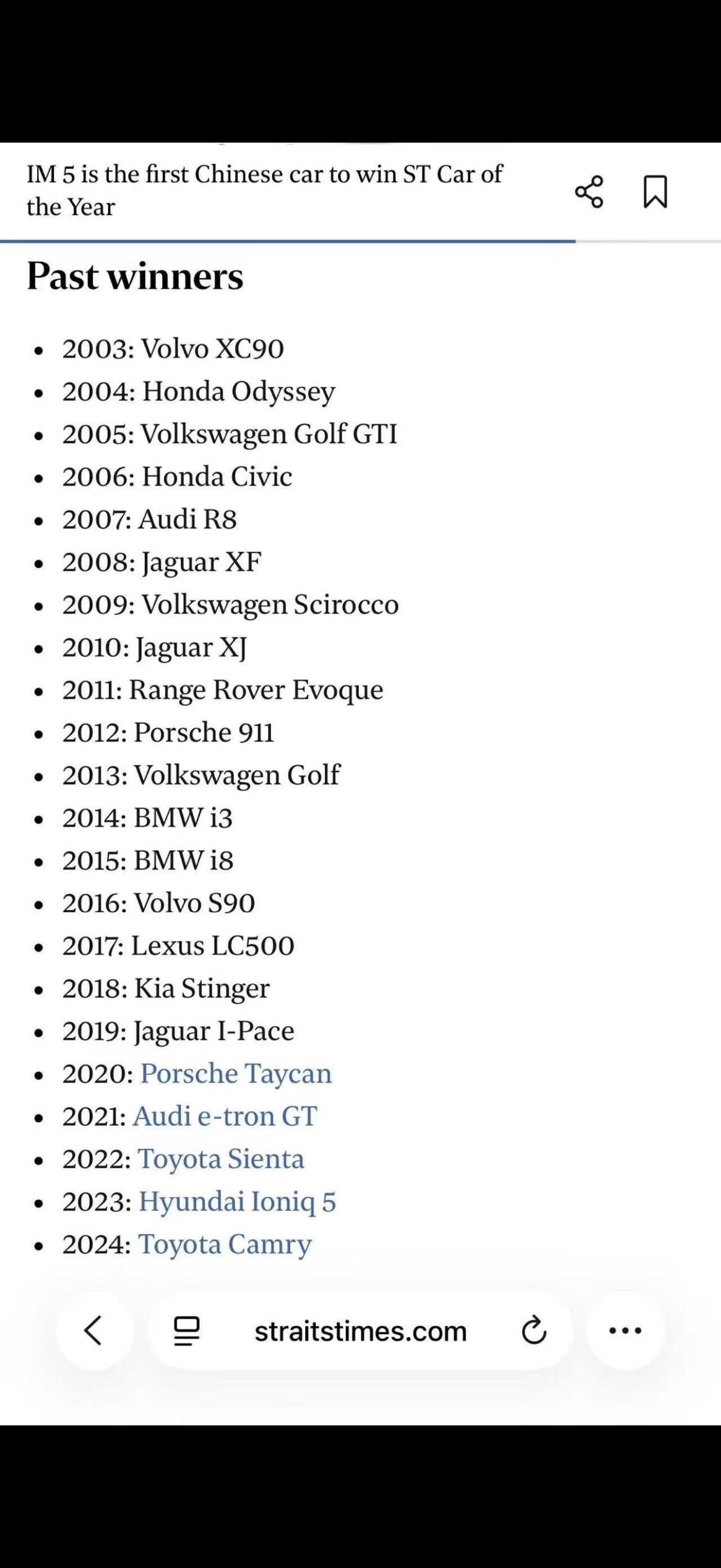 新加坡《海峡时报》刚公布了年度车型,拿奖的是智己IM5。 而且这是这个奖办了 2