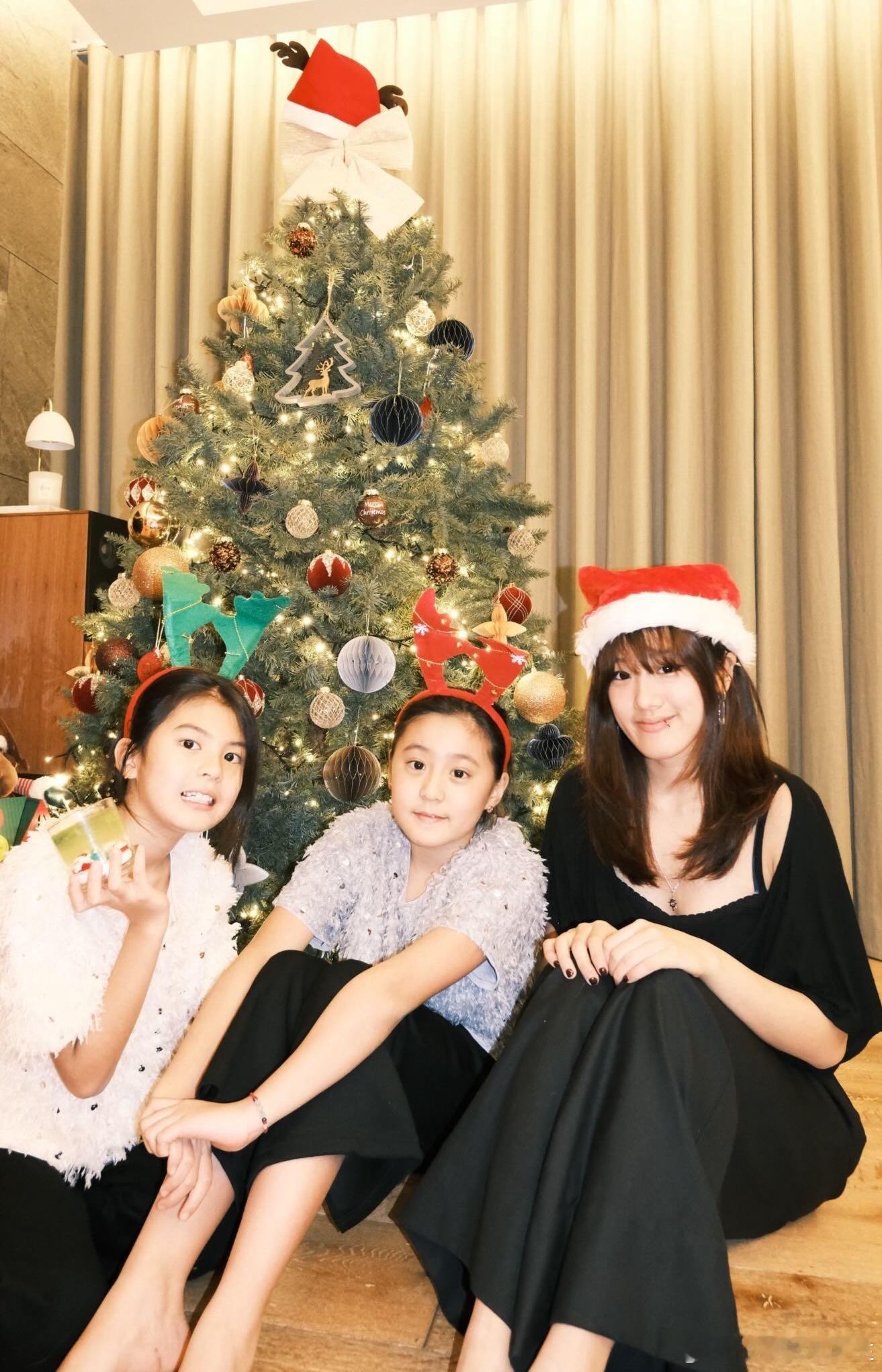 贾静雯一家子齐齐整整过圣诞,大女儿梧桐妹也在一起。贾静雯和老公都戴着圣诞帽,穿