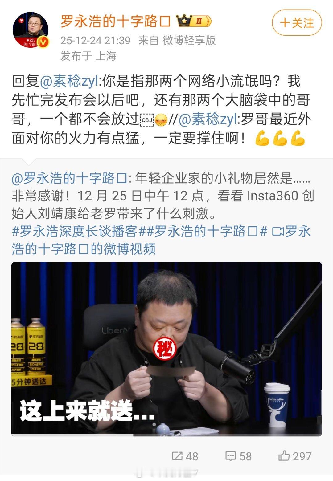项立刚四评罗永浩创业为啥不成功——缺少前瞻思维。罗永浩疑似回应近期舆情:先忙完发布会,以后一个都不会放过。【你是指那两个网络小流氓吗?我先忙完发布会以后吧,还有那两个大脑袋中的哥哥,一个都不会放过】今日吃瓜项立刚回应罗永浩谩骂热点观点全网热点共创计划