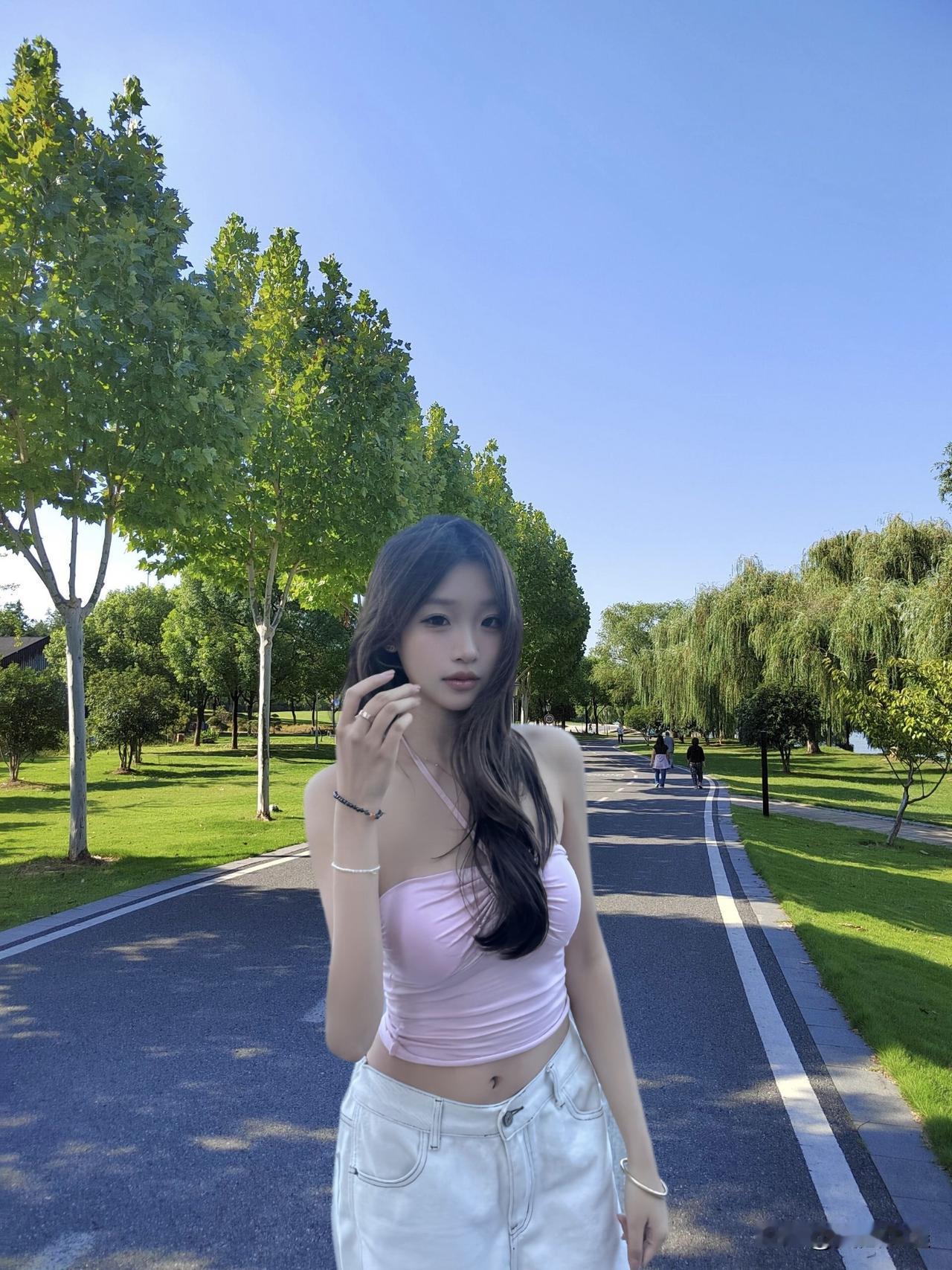 阳光明媚的公园散步,清新粉色上衣搭配白色牛仔裤,轻松自在的一天。🌞💕