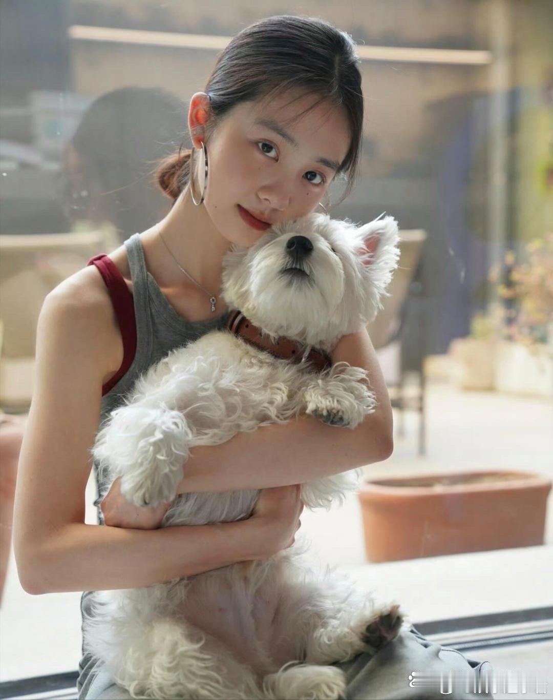 黄多多和狗狗拍照黄多多晒出和白色西高地犬的合照也太治愈了吧!灰色背心配牛仔裤,素