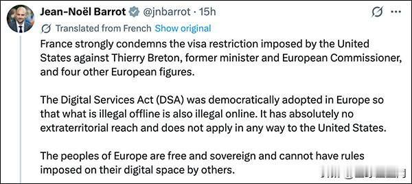 【马克龙谴责美国制裁法国籍欧盟前官员 :这等同于是恐吓胁迫】美国对一名欧盟前高级官员和其他四名欧洲活动人士实施签证制裁的行为,惹怒了法国。 在被制裁的欧盟委员会前委员、法国人蒂埃里·布雷东怒斥美国此举是“麦卡锡式的政治迫害”后,法国总统马克龙、外交部长让-诺埃尔·巴罗12月24日也在社媒平台X上表达了强烈的谴责。 “这些措施等同于恐吓和胁迫,旨在削弱欧洲的数字主权。”马克龙言辞激烈地谴责道,“欧盟的数字监管规则是欧洲议会和理事会在民主和主权程序下通过的。它们在欧洲范围内适用,旨在确保平台之间的公平竞争,并不针对任何第三国,同时确保线下非法的行为在线上同样非法。欧盟数字空间的规则不应由欧洲之外来决定。” 巴罗同样指出,“《数字服务法案》是在欧洲通过民主程序制定的,旨在确保线下非法的内容,在线上同样非法”。他强调,该法案“完全不具有域外适用性,也绝不影响美国”。 巴罗写道,“欧洲人民是自由而且拥有主权的,不能让他人将规则强加于他们的数字空间”。 法国籍欧洲议会议员拉斐尔·格卢克斯曼也在一封给美国国务卿鲁比奥的信中写道,“我们不是美国的殖民地。我们是欧洲人,必须捍卫我们的法律、我们的原则、我们的利益。针对布雷东的这一令人愤慨的制裁,正是对他捍卫我们主权的斗争的致敬。我们将继续这一斗争,斗争到底。” 英国路透社指出,本月初,欧盟以违反网络内容规则为由,对美国亿万富翁马斯克旗下的X处以1.2亿欧元(约合9.92亿元人民币)的罚款。 X被罚的消息传出后,包括美国总统特朗普在内的一众美国官员都站出来声援马斯克。特朗普当时还警告欧洲得“非常小心”了,因为欧洲正走向糟糕的方向。
