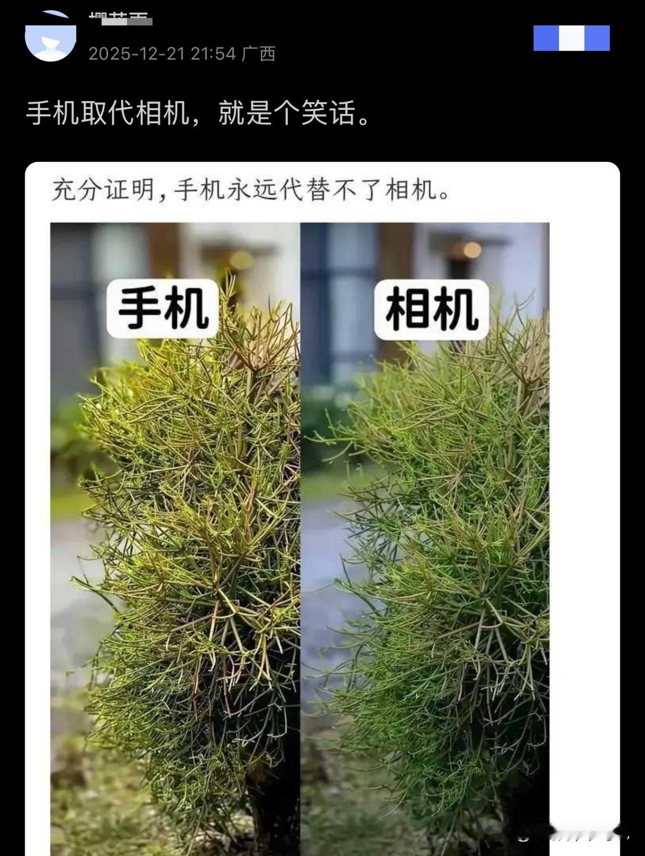 用一张图就能证明手机永远取代不了相机?还说用手机取代相机就是笑话?!我只能说这话说得太满太绝对,非要用相机的优势去痛击手机的短板,得出的结论一定是不客观的。我们先看这张对比照,对比者居然用手机人像模式去拍边缘极其不规则又多层次繁多的针叶类植物,这算不算自己找不自在我不清楚,我只能说他不懂手机。这样做不是自曝其短?你咋不说手机太小了,没有专业相机那么大,拿在手上显得不够扯眼球,所以手机永远取代不了相机?事实上,对于绝大多数人而言手机还真就可以取代相机,用手机拍出来的效果比他们用相机拍出来的更好。没办法,手机在拍摄时就做了很多优化,而相机还需要繁杂的后期。相机比手机更优秀永远只对专业摄影师、骨灰级爱好者有效。普通人平时就发个抖音、朋友圈儿什么的,手机还真就具有碾压性的优势。