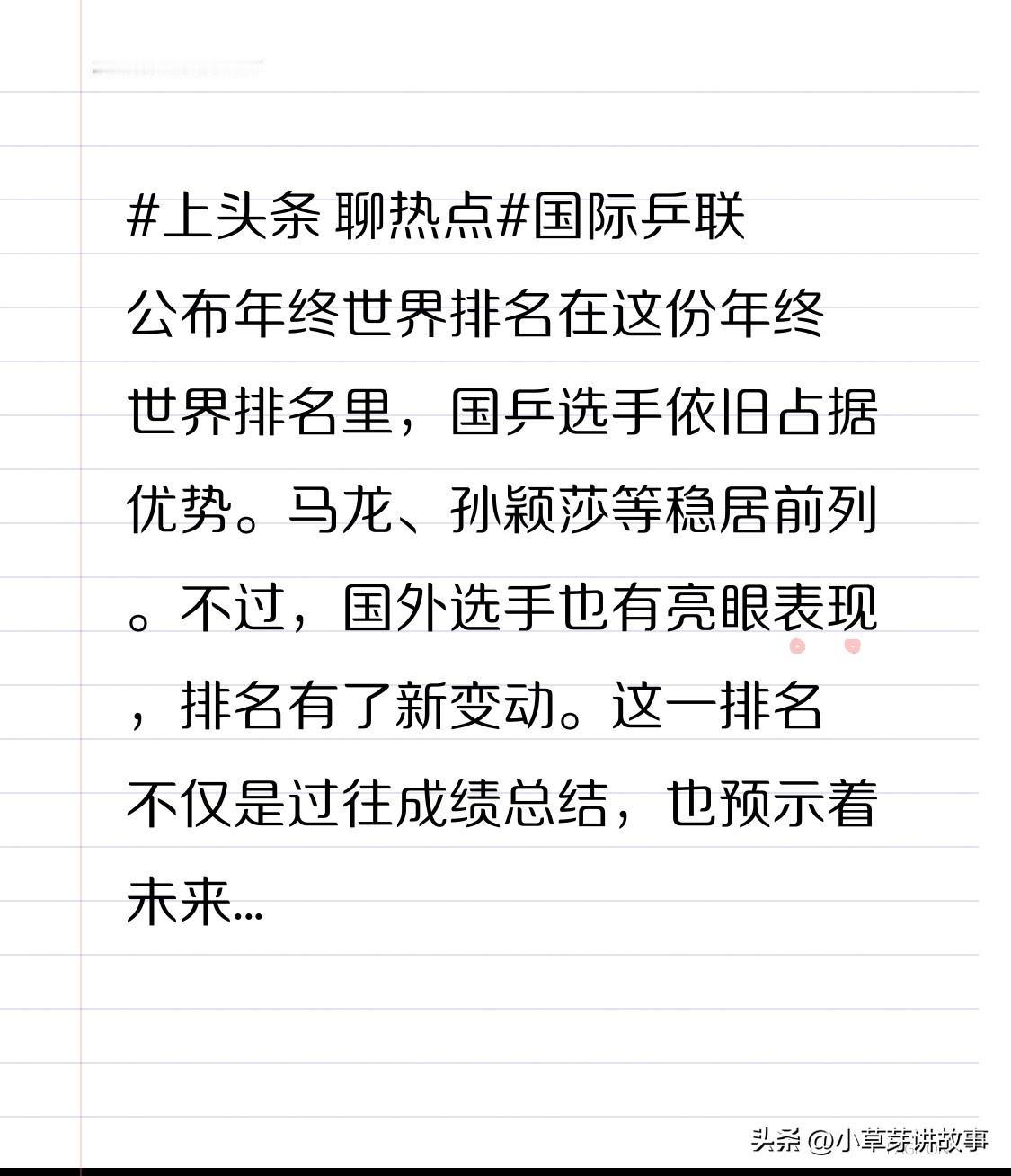 国际乒联公布年终世界排名在这份年终世界排名里,国乒选手依旧占据优势。马龙、孙颖莎等稳居前列。不过,国外选手也有亮眼表现,排名有了新变动。这一排名不仅是过往成绩总结,也预示着未来赛场竞争会更精彩!