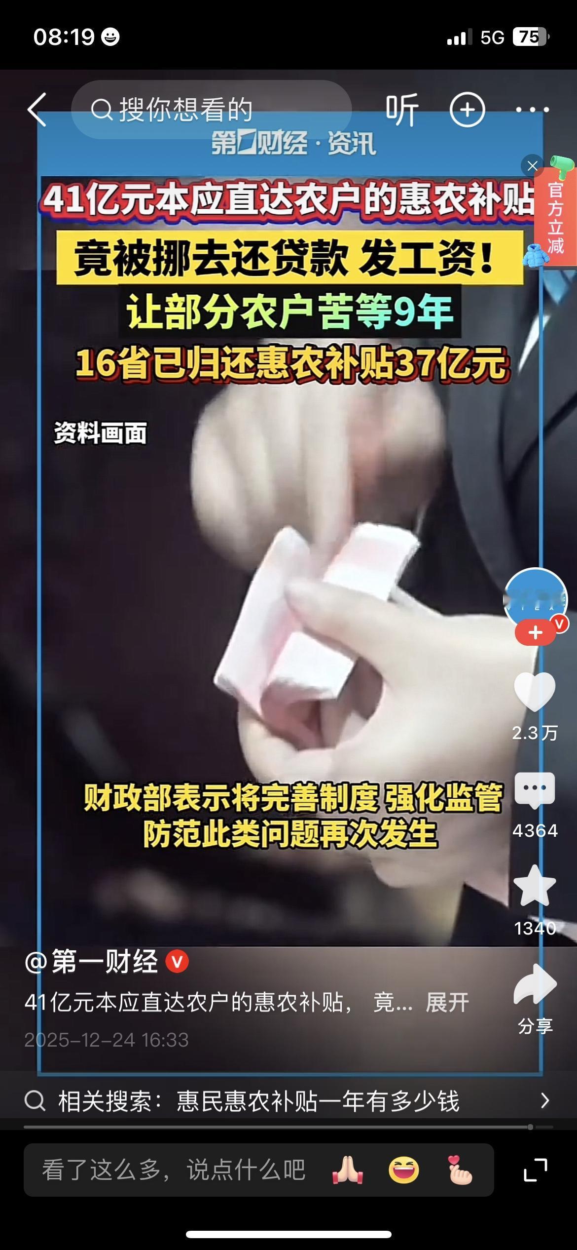41亿惠农补贴被挪用,农户苦等9年 东北种粮户王大爷,攥着补贴申请表等了9年,始终没拿到种粮补贴,直到今年才知道钱被县里挪去还债务、发工资了。 2025年6月审计署披露,16省175县截留挪用41.64亿元惠农补贴,涉及种粮、农资等多项农户福利。 目前16省已归还37亿元,剩余资金也在追缴中。 财政部明确要让补贴直达农户账户,还设立了违规追责机制。 王大爷也拿到了拖欠9年的补贴款,总算对明年种植有了盼头。 惠农补贴资金直达账户,能彻底杜绝挪用问题吗? 你身边有农户遇到过补贴拖欠的情况吗?评论区说说~农业生产补贴