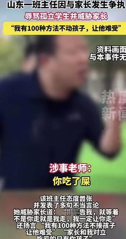 谁给你的权利?山东,一家长和老师发生争执,谁知班主任辱骂孩子: 狗尾巴草就是狗尾巴草,永远变不成花,她又辱骂家长: 我不是骂你,你就是吃了屎,这不是骂人,这是形容,我有100种方法不动孩子,让他难受,家长和我对立,吃亏的只有你的孩子……警方已经介入调查。 据家长陈述,事发当天下午课间,其孩子因未在规定时间内返回教室,被班主任以“违反课堂纪律”为由,单独留在教室外接受惩罚。 整个过程未提前告知家长,也未通过电话、家校平台或其他方式进行说明。 放学时间已到,家长按惯例到校门口接孩子,却迟迟未见人影。多次拨打孩子电话无人接听,在校园周边寻找无果后,家长情绪迅速从焦急转为恐慌。 该家长表示,近年来社会安全事件频发,在完全不知情的情况下孩子“失联”,让其产生了强烈的不安和最坏的联想。 随后,家长进入校园询问情况,在班级外找到孩子,并与班主任发生正面冲突。 冲突过程中,班主任的言语被指严重失当。多段现场录音及家长转述显示,班主任在情绪激动下,对学生当众辱骂称: “狗尾巴草就是狗尾巴草,永远变不成花。” 该言论被认为对未成年人造成明显人格侮辱。 更令家长愤怒的是,随后班主任将矛头转向家长本人,用极端粗俗的语言进行所谓“比喻式评价”,并坚称“不是骂人,只是形容”,引发现场情绪彻底失控。 事件并未止于言语冲突。家长称,在争执过程中,班主任态度强硬,多次以“为孩子好”“老师有管理权”为由拒绝道歉,并公开对家长发出威胁性言论,大意为: “你敢告我,我有一百种办法不动孩子,也能让他难受。” “家长和我对立,最后吃亏的只有你的孩子。” 此类表态被家长理解为变相威胁和权力施压,也是舆论最为关注的焦点之一。 事件发生后,家长第一时间选择报警并向教育部门反映。警方随即介入,对相关录音、监控及证人进行取证核实。当地教育主管部门也表示已关注此事,正在配合调查。 目前,涉事班主任是否存在违规惩戒、语言侮辱、威胁未成年人等行为,仍有待官方调查结论。涉事学生已由家长陪同进行心理安抚,家长表示不排除通过法律途径维护孩子的合法权益。 事件在网络曝光后,很快引发了强烈反响。相关录音与文字描述在多个平台传播,不少网友在了解事情经过后表示震惊与愤怒,话题迅速登上本地热议榜单。 评论区中,最集中的声音指向涉事班主任的职业素养与师德问题。许多网友直言:“如果这都算老师,那家长怎么放心把孩子交给学校?” “不敢想象孩子每天面对的是怎样的语言环境。”有人指出,教师不仅承担教学任务,更承担着引导、保护未成年人的责任,而将情绪宣泄到学生和家长身上,本身就违背了教育初衷。 不少网友对“狗尾巴草永远变不成花”的说法尤为愤怒,认为这种言语对孩子的伤害可能远超一次体罚。“成绩可以暂时不好,但人格不能被否定。” “一句话可能毁掉孩子一辈子的自信。”类似留言在评论区屡见不鲜。也有家长表示,孩子在成长阶段极度敏感,被贴上贬低性标签,可能长期留下心理阴影。 对于班主任被指威胁家长的言论,更是引发舆论哗然。大量网友认为,这种“你告我孩子就会更难受”的说法,已经超出师生矛盾范畴,带有明显的权力压迫意味。 “这不是教育,是赤裸裸的威胁。”“老师手里的权力一旦失控,比体罚更可怕。”有网友如此评论。 与此同时,也有教育从业者发声,呼吁社会不要回避问题。“不是反对老师管学生,而是反对用羞辱和恐吓的方式管理。” 他们认为,真正让人害怕的,不是一位情绪失控的老师,而是这种行为如果得不到纠正,可能被默许甚至被合理化。