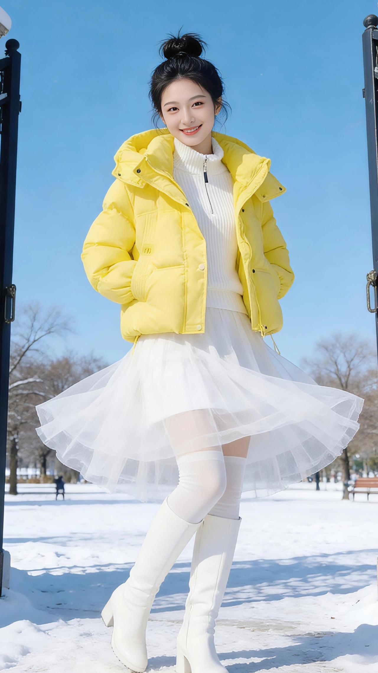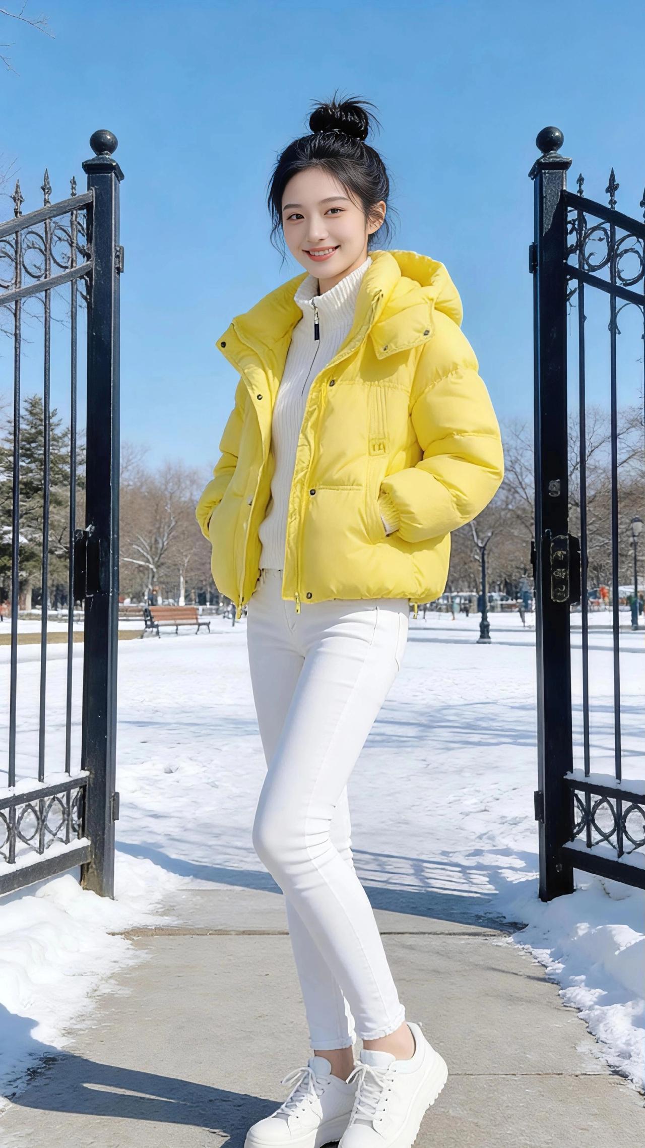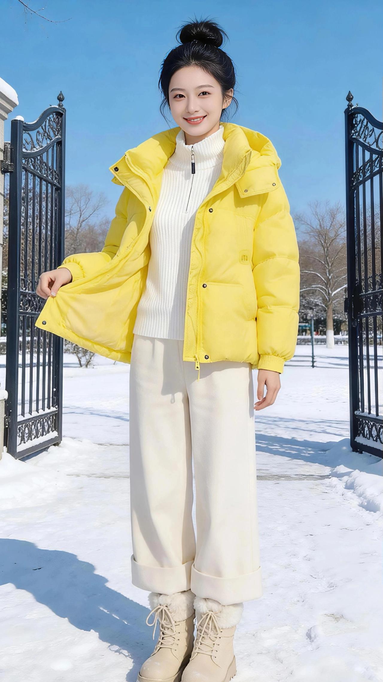 雪日黄裳 冬日的雪,把天地揉成了一张干净的宣纸,素白的底色上,唯有那抹明黄,像蘸了暖阳的笔锋,在铁艺门旁轻轻一点,便漾开了整个冬天的鲜活。 她站在雪地里,蓬松的黄色羽绒服裹着一身暖意,像揣了颗小太阳。配卡其工装裤时,是踩着马丁靴踏雪的率性,裤脚的褶皱里藏着未泯的少年气;换了白纱裙,又成了雪地里开出的软云,纱裙扬起来的弧度,把冬日的冷冽揉成了温柔的絮;米白阔腿裤的宽松,是慵懒的人间烟火,雪地靴踩在雪上咯吱响,像在数着阳光的碎影;白裤利落,黑裤飒爽,灰卫裤则是把松弛揉进了骨里,抬手比出的剪刀手,让寒风都绕着弯儿变软。 发髻高高挽起,露出的笑眼弯成月牙,那抹黄在雪色里晃悠,不是刻意的张扬,只是把春天的甜,悄悄藏进了冬日的口袋。原来冬天从不是只有冷与白,一件亮色的衣,一颗鲜活的心,就能让漫天风雪,都变成温柔的陪衬。 高级感穿搭 小个子穿搭 过年穿什么 棉衣棉服