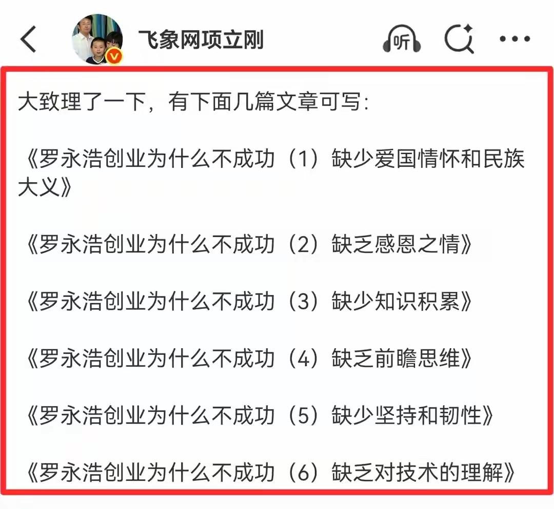 项立刚称罗永浩除了直播啥也做不成你怎么看谢邀:最近两个嘴碎的怼在一起,真的是热闹。[笑哭] 对我们普通百姓来说,谁输谁赢不重要,重要的是看怼人时能否有事实依据,能否让人信服,而不是泼妇一样人身攻击,失去名人应有的气度和修养! 所以大家不用理会他们这样的人,其实他们唯一的目的就是蹭热度赚流量让货卖得更快更赚钱而已! 真正搞实业的企业家那有这闲空时间浪费在网络上和别人相互攻击!