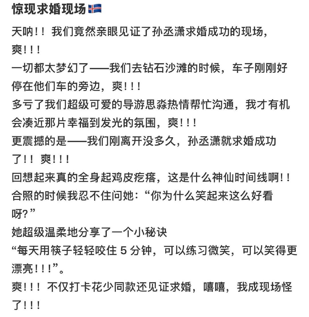 网友见证孙丞潇求婚金莎现场金莎冰岛教网友怎样微笑 12月24日,网友分享自己在冰岛见证了求婚成功现场。网友还问金莎为什么笑起来这么好看?金莎特别温柔热心教网友怎样微笑:“每天用筷子轻轻咬住5分钟,可以练习微笑,可以笑得更漂亮!”网友偶遇被求婚后的金莎