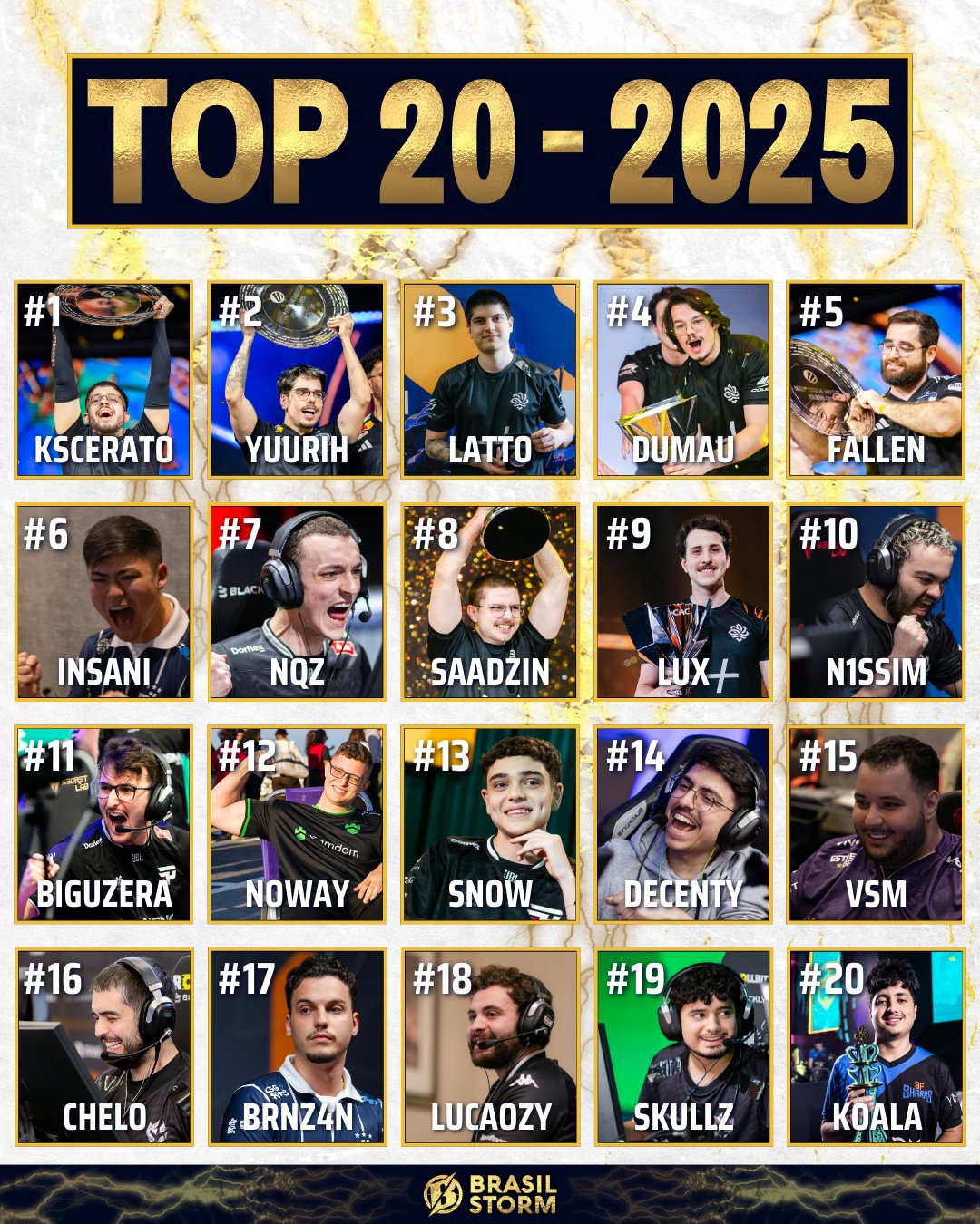 虎扑12月25日讯巴西国内媒体BrasilStormCS公布2025年巴西CS2年度TOP20榜单:来自FURIA的步枪手KSCERATO荣膺巴西年度TOP1,这也是其连续三年蝉联巴西TOP1殊荣。其队友yuurih获评TOP2,上海CAC冠军+MVP得主latto荣膺TOP3。
