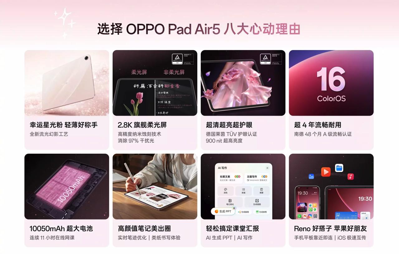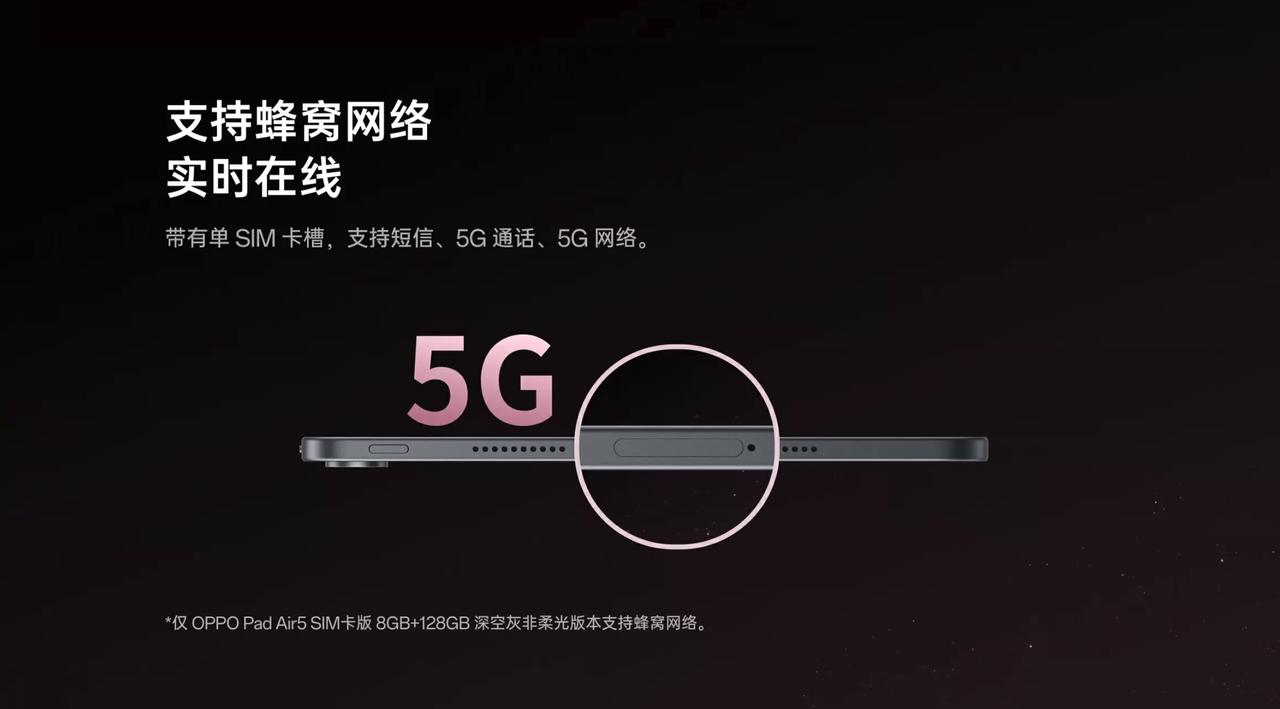 OPPO 平板 Air 系列更新,OPPO Pad Air5(OPD2501),8+128GB 售价 1899 元、8+256GB 售价 2199 元、12+256GB 售价 2499 元,仅 256GB 提供柔光版,比普通版贵 200,还有一个可以插 SIM 卡的版本,8+128GB 深空灰,售价 2399 元。[吃瓜群众] - 芯片:联发科天玑 7300-Ultra 处理器,LPDDR5X 内存,UFS 3.1 闪存; - 屏幕:12.1 英寸 2800×1980 LCD 屏幕,全局最高亮度 600nits,全局激发亮度 900nits,120Hz 刷新率,最高 540Hz 触控采样率,支持 12bit 色深(8+4bit); - 相机:前置 8MP,后置 8MP; - 续航:10050mAh 电池,33W 快充(兼容 33W UFCS); - 其他:厚 6.83mm,重 597g,深空灰、星光粉 2 款配色,支持 Wi-Fi 6、USB 2.0、超线性四扬声器,ColorOS 16 系统,SIM 卡版重 599g,支持 SD 卡扩展、单频北斗+单频 GPS。