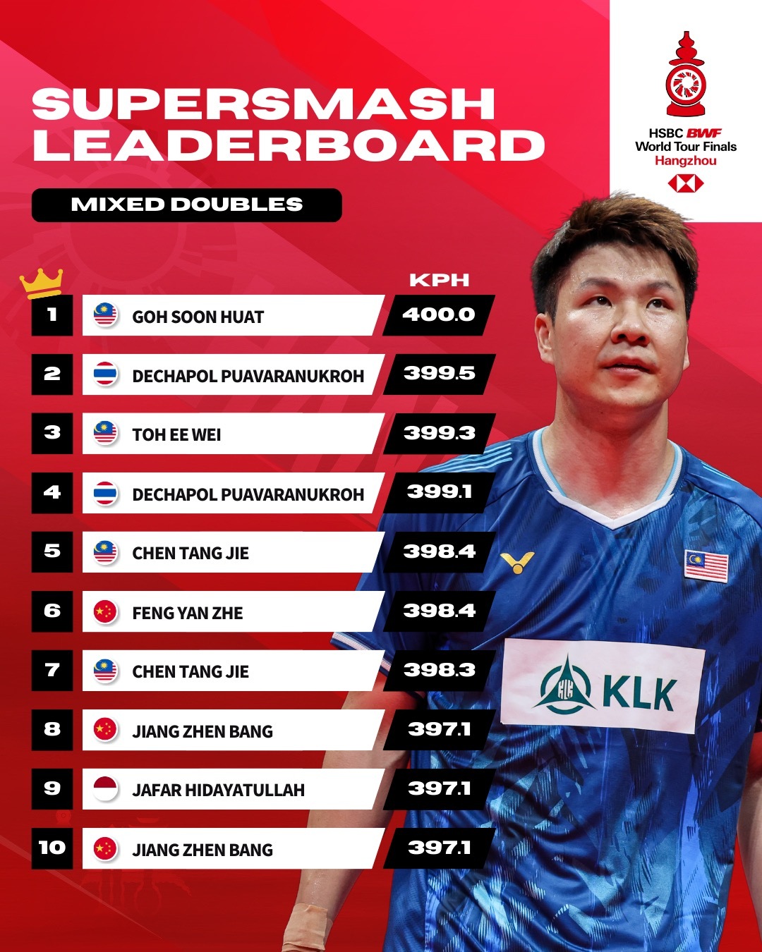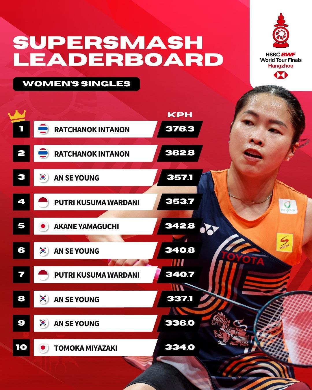 2025年世界羽联年终总决赛 杀球时速榜男单:TPE周天成女单:🇹🇭因达农男
