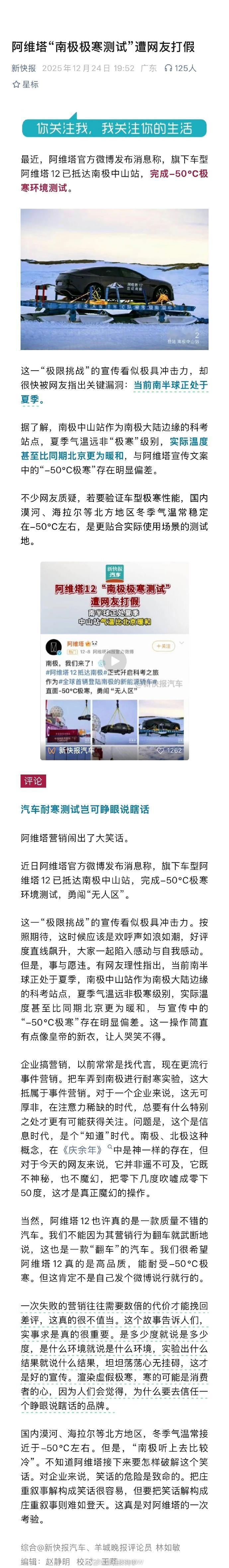 看到阿维塔南极测试被打假的事,挺感慨的。车企想靠极限测试做产品背书,用事件营销获