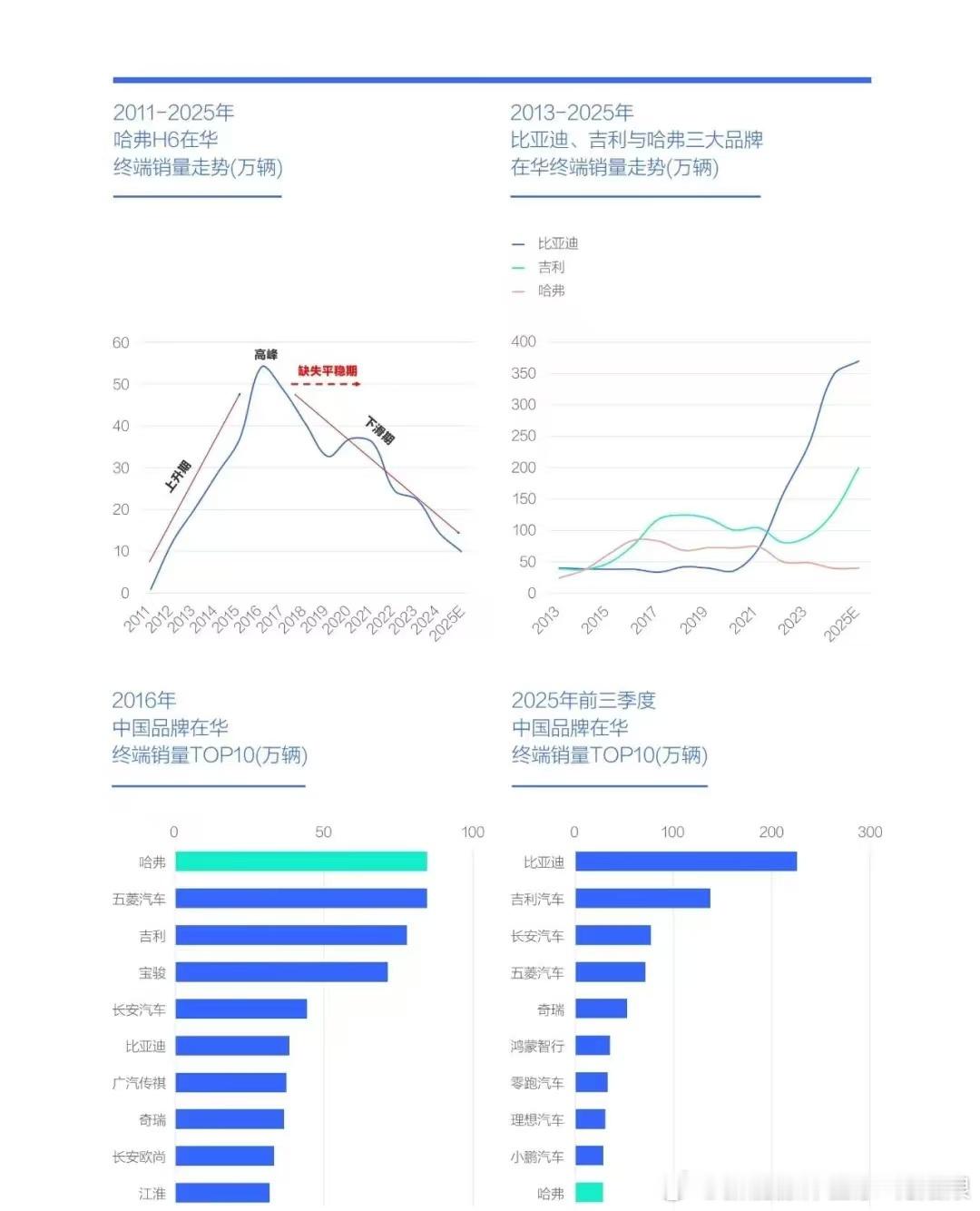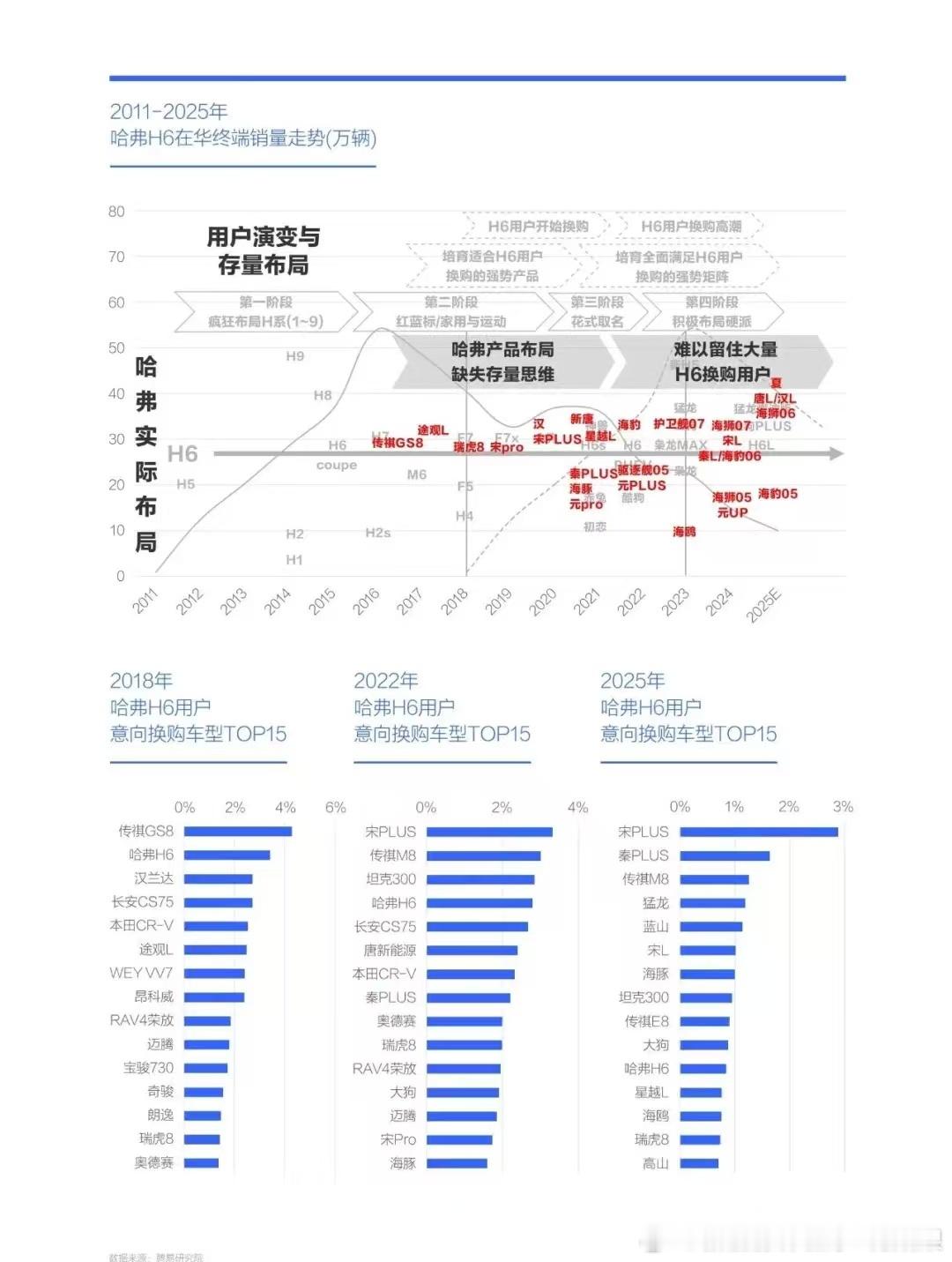 腾易研究院报告哈弗H6的过山车人生:14年从巅峰跌回原点,换购潮+二手车夹击+节能车围剿,三大暴击谁顶得住?太平洋汽车显示H6 2025年11月销量6610辆,较2023年同期23291辆暴跌71%。后H6时代,长城要靠轻越野还是小电动翻盘?