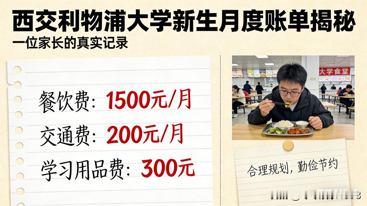 家长晒出儿子西交利物浦大学大一第一学期的生活费账单:原计划每月 3000 元(仅餐饮、日常用品),实际 9-12 月总花 20170 元,平均每月 5000 元出头,11 月、12 月因频繁和同学跨城游玩,12 月额外给钱仍显不足。 西浦坐落苏州,作为中外合作大学,校园活动丰富。苏州地处长三角核心区,高铁 1 小时可达上海、杭州、南京,学生约伴出行方便。当地餐饮、文化消费价格偏高,一份校园周边套餐约 35-45 元,跨城短途游(如无锡、杭州)人均交通住宿 500 元左右。 核心来看:西浦的高开销有合理性 —— 国际化校园常组织跨文化交流活动,加上长三角优越的交通网络,学生社交频率自然更高。在江浙沪地区,高校生活费普遍在 4000-6000 元区间,西浦 5000 + 属于中等偏上,反映了长三角地区的消费能级和国际化学生的社交成本。