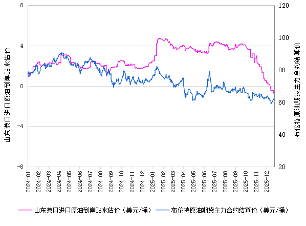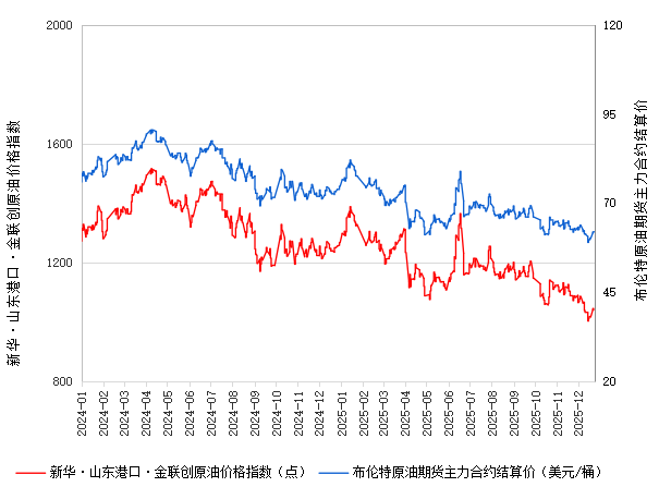 新华财经北京12月25日电(郑大伟)截至2025年12月24日,新华·山东港口·金联创原油价格指数(SPGCIPI)报1039.29点,较前一交易日下跌4.87点,跌幅0.47%;进口原油即期价格为64.08美元/桶,合人民币3252.94元/吨。山东港口进口原油综合到岸贴水估价为-0.73美元/桶,较前一交易日下跌0.18美元/桶。