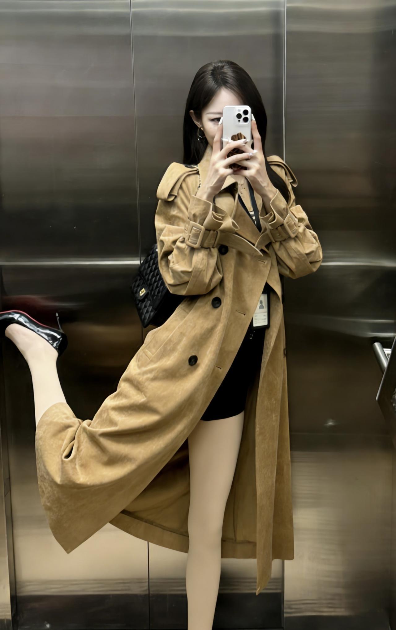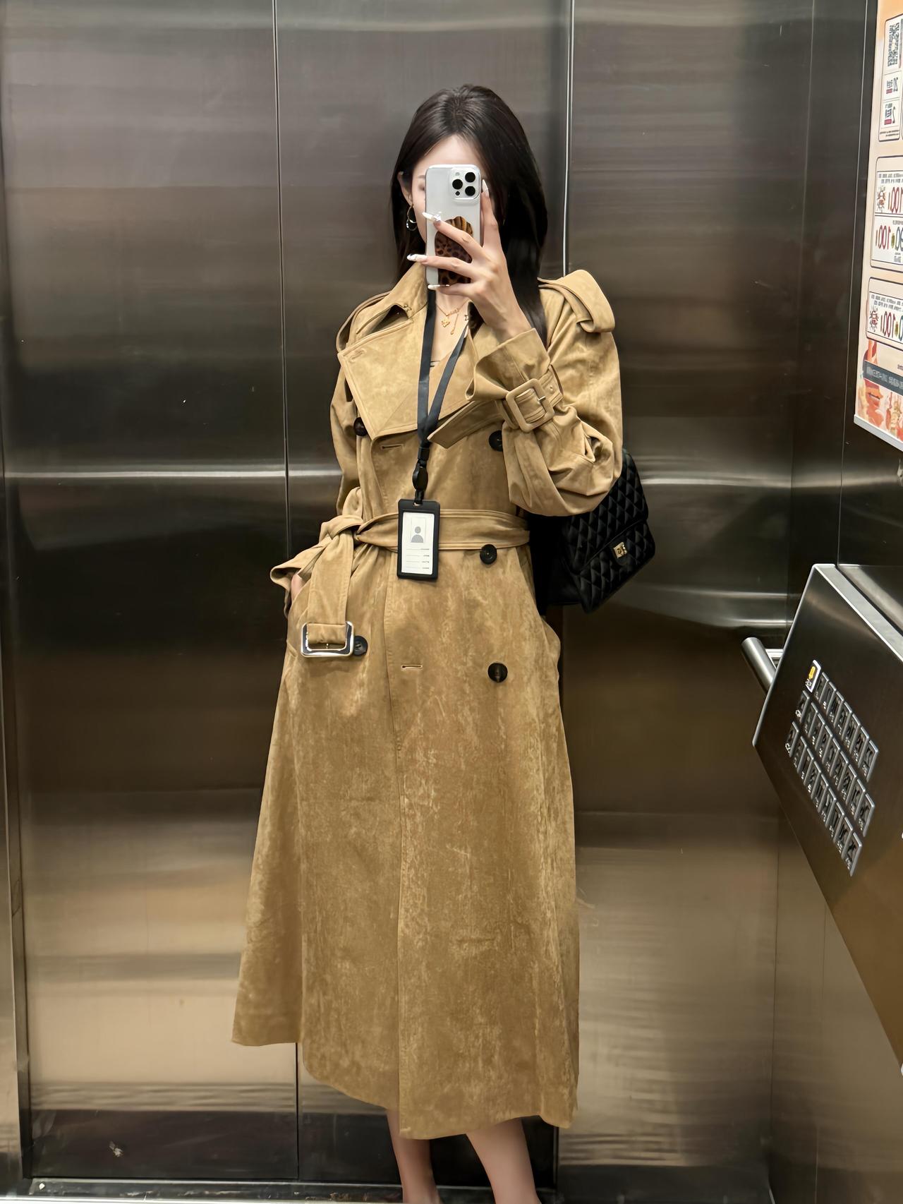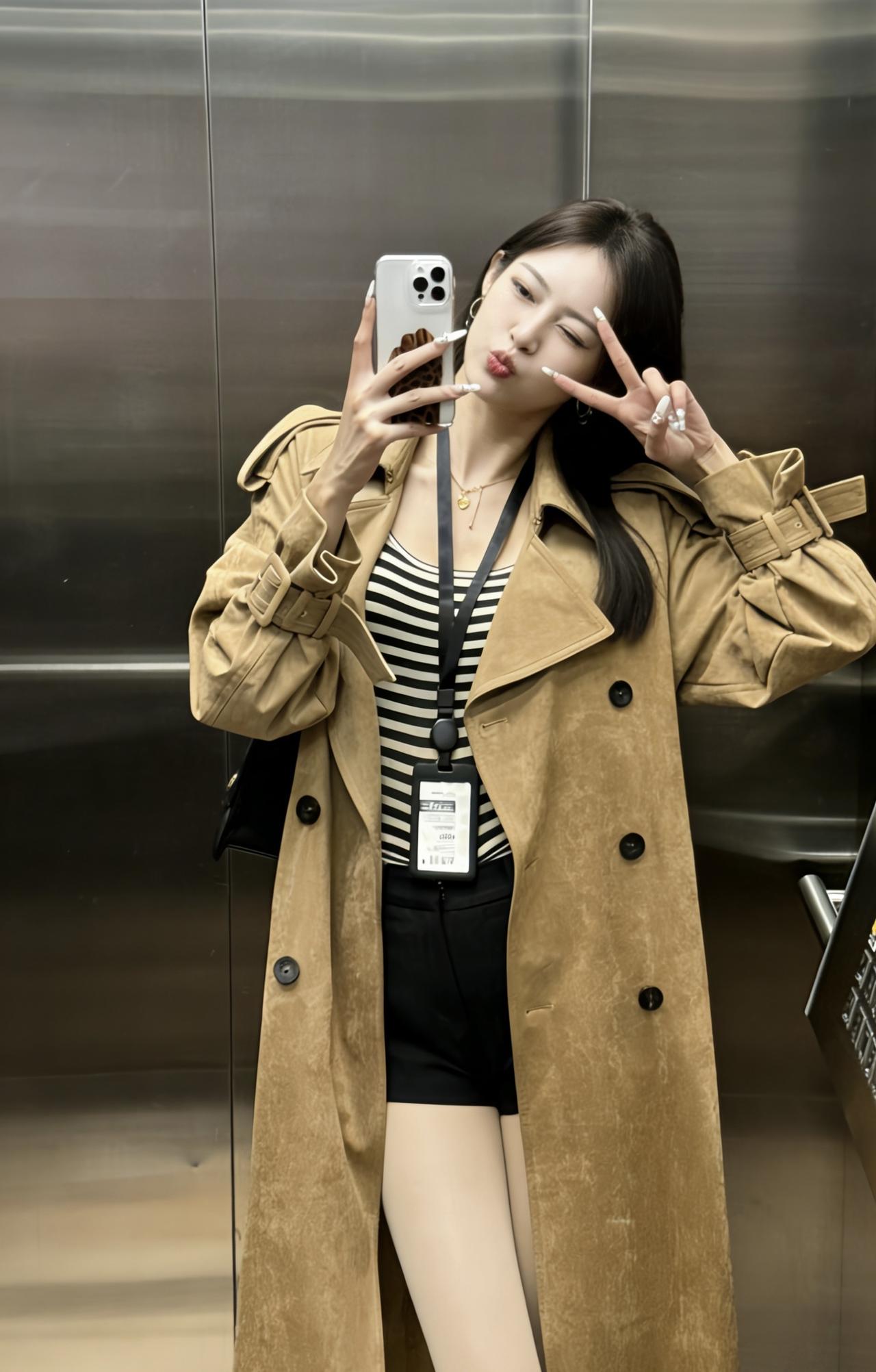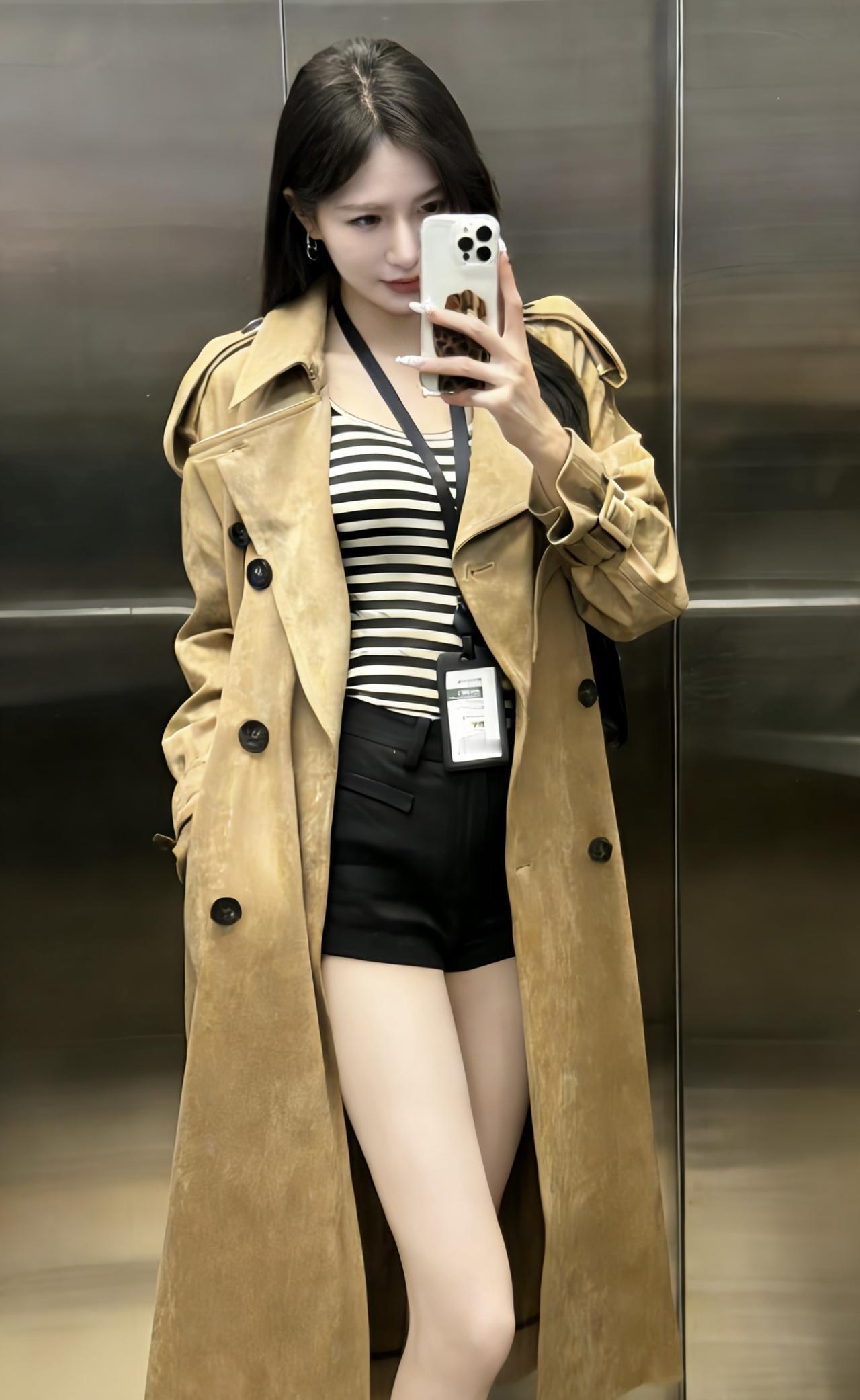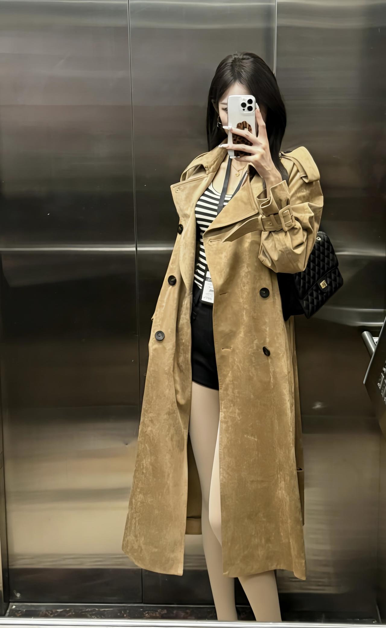今日穿搭推荐是休闲通勤风的混搭路线,核心单品及搭配逻辑如下: 1. 外层:卡其色长款麂皮风衣,自带质感与气场,宽松版型弱化了正式感,增添随性氛围; 2. 内搭:黑白条纹吊带,简约又有视觉层次,修身设计勾勒线条,中和风衣的厚重感; 3. 下装:黑色高腰短裤+光腿神器,拉高腰线显腿长,短裤的休闲感平衡了风衣的通勤属性; 4. 配饰:黑色菱格包提升精致度,工牌则强化了职场通勤的细节感。 适合场合 日常通勤、逛街、下午茶、探店打卡等。