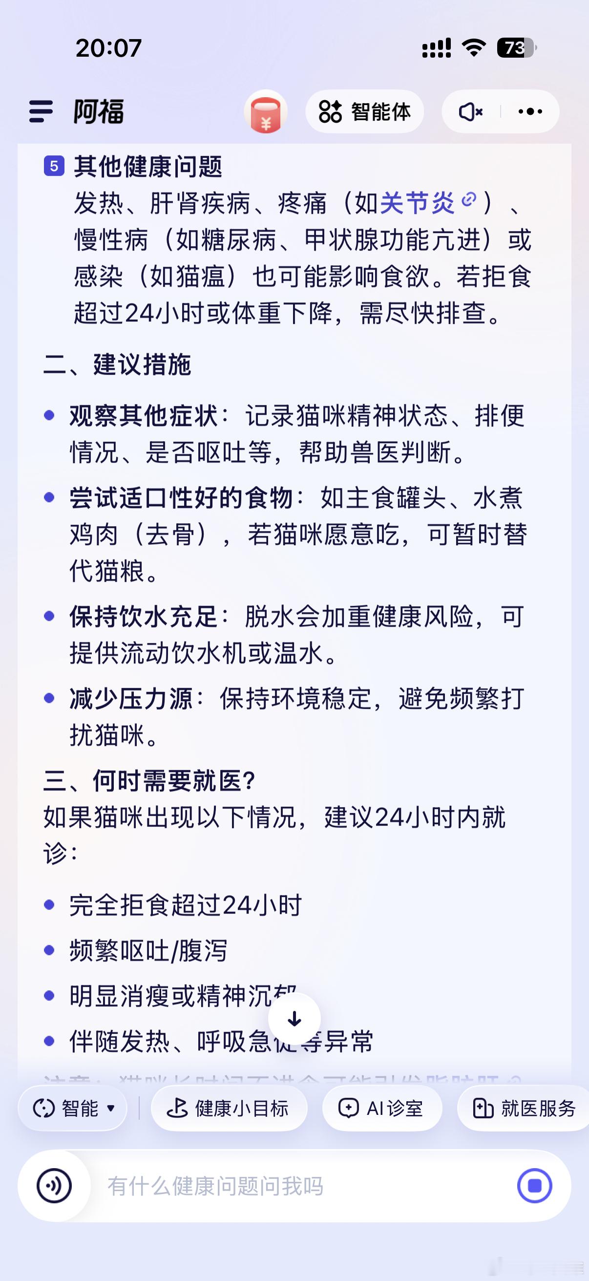 AI救我狗命以前毛孩子出点小状况,要么硬扛要么瞎跑医院,又费钱又操心!🤦🏻♀️自从更了蚂蚁阿福最新版,再也不用纠结了。不管是猫咪🐱流口水、猫咪没精神没食欲,都能在AI诊室描述症状,一键排查是应激、饮食问题还是疾病预警,分清可观察和急就医的情况,还会整理护理要点和复查提醒。精准又省心,妥妥的养宠焦虑救星,铲屎官必备神器~