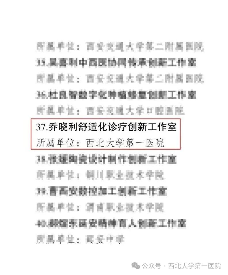 近日,陕西省教科文卫体工会委员会发布《关于发挥好2025年陕西省教科文卫体工会重点支持创新工作室和创新工作室联盟作用的通知》(陕教科文卫体工发〔2025〕24号),西北大学第一医院“乔晓利舒适化诊疗创新工作室”成功入选2025年陕西省教科文卫体工会重点支持创新工作室名单。