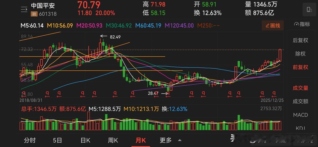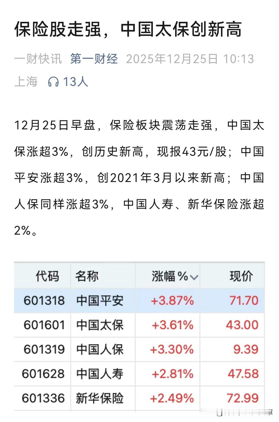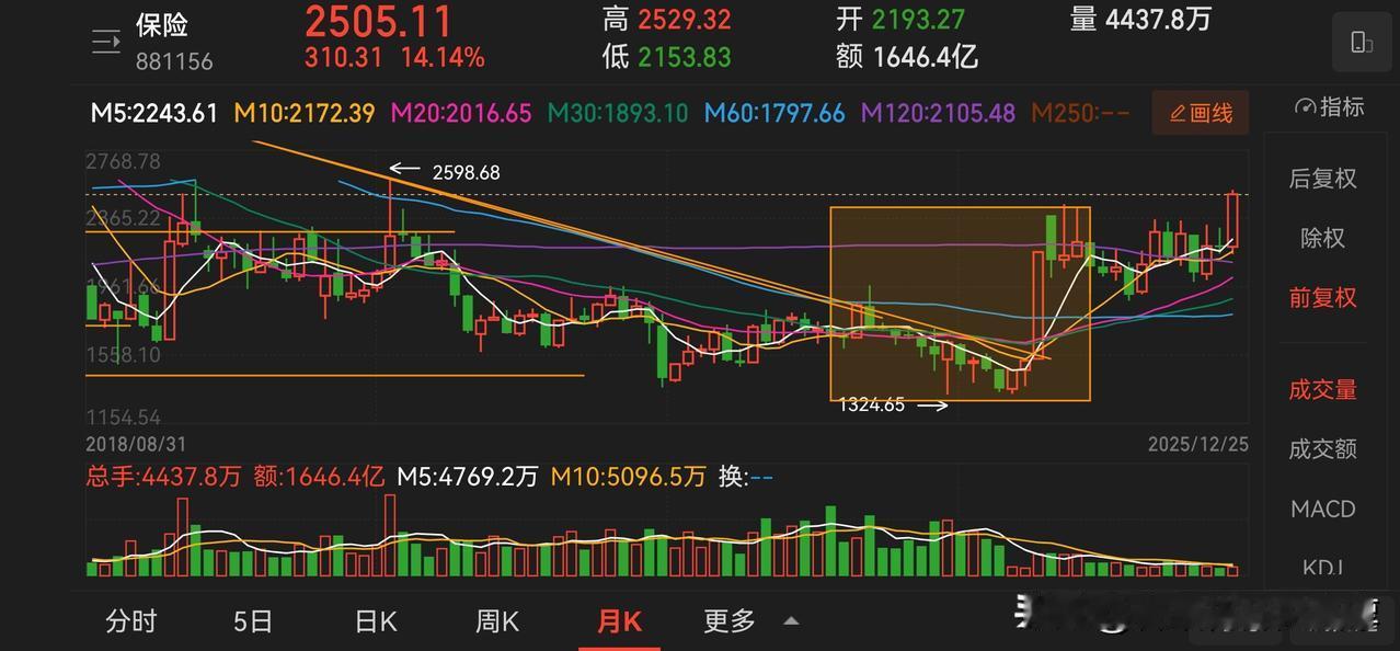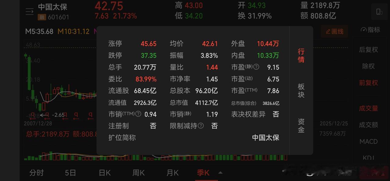 今天看到新闻说中国太保历史新高了,看了一下走势,果不其然。最近我们在持续关注保险股的走强,太保是其中最强的品种。 在保险板块里,太保算是市值比较小的一个,能拉出新高说明走势比较强势。相比而言,中国平安还没有做到。 如果我们仔细看保险板块的话,首先就是量能看起来不是太正常,在这种情况下,我们去观察这种上涨,两个基本判断:一个就是保险股已经被高度控盘,另外一个就是好戏可能刚刚开始。 上市公司中的正宗保险股数量还是有限的,这一点和券商银行就有极大的不同,但是他们相比而言盘子也非常大,市值非常高,另外一个对于市场牛熊的敏感度也很高。 如果后市看好大盘走强的话,保险股会是一个非常好的选择。