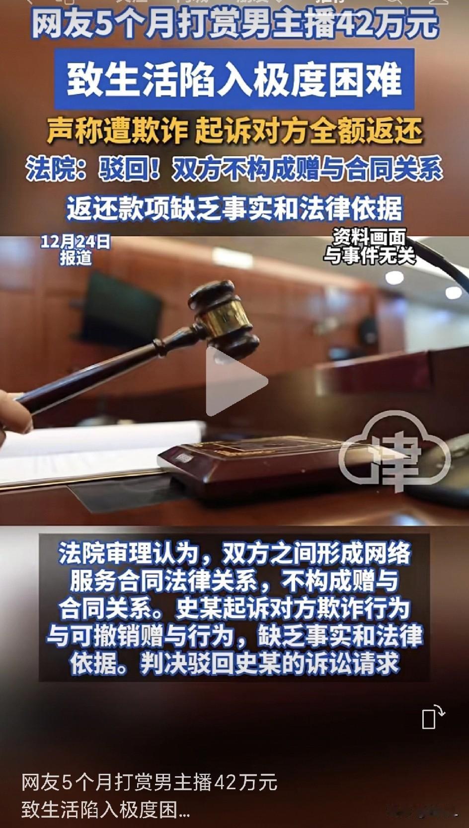 醒醒!5个月打赏男主播42万倾家荡产,法院:成年人得认账!网友:这哪是正能量,这是正钞能量啊! 都说网络世界深似海,可山西一位网友的“豪掷千金”,还是惊掉了全网下巴—— 短短5个月,给一位情感男主播打赏42万! 打到自家日子过不下去,最后闹上法院要讨钱,结果……法院一句话噎回来了:“成年人,得为自己的‘真爱’买单!” 事情是这样的: 去年4月到9月,网友史某在某手平台迷上了一位情感主播田某甲,觉得对方“正能量满满”,手指头一点,42万多就刷出去了。 直到自己生活困难,才回过神来,气得一纸诉状告上法庭:“他根本是演的!诱导我花钱!” 结果法院咋说? 1. 这不是赠与,是消费! 你花钱,主播表演,这叫“网络服务合同”,跟买电影票一个道理。 2. 证据不足! 你说主播骗你,证据呢?成年人自己点的打赏,法律认这是“自愿行为”。 3. 平台和主播分钱,那是行业常规操作,不违法。 所以,法院一锤定音:驳回!钱不退! 网友彻底炸锅: “正能量人设?这分明是‘正钞能量收割机’!” “5个月42万?这哪是追主播,这是给主播打工啊!” “建议平台加个弹窗:‘您已打赏够买一辆宝马,确认继续吗?’” “主播:感谢大哥送来的火箭!大哥:现在能退吗?不行?那我先吃土去了……” 玩笑归玩笑,这事儿敲的警钟是真沉重: 👉成年人,手滑要负责——法律不保护“后悔的冲动”,刷礼物前先问问自己:这钱非花不可吗? 👉警惕“人设陷阱”——屏幕那头是暖心大哥还是演技派,谁也说不清。 👉留好底线——别拿活命钱追星,更别借钱打赏,倾家荡产的爱,没人感动。 法院也说了: 要是主播真骗人、用夫妻共同财产打赏、或是未成年人偷刷,法律另有说法。可这回,条件都不符,只能自己认了。 最后送句话: 网络有情,打赏无情;手指一抖,钱财飞走。理性吃瓜,捂紧钱包,咱普通人过日子——刷再多礼物,不如给自己碗里加个鸡腿! 素材来源:津云,侵联删!