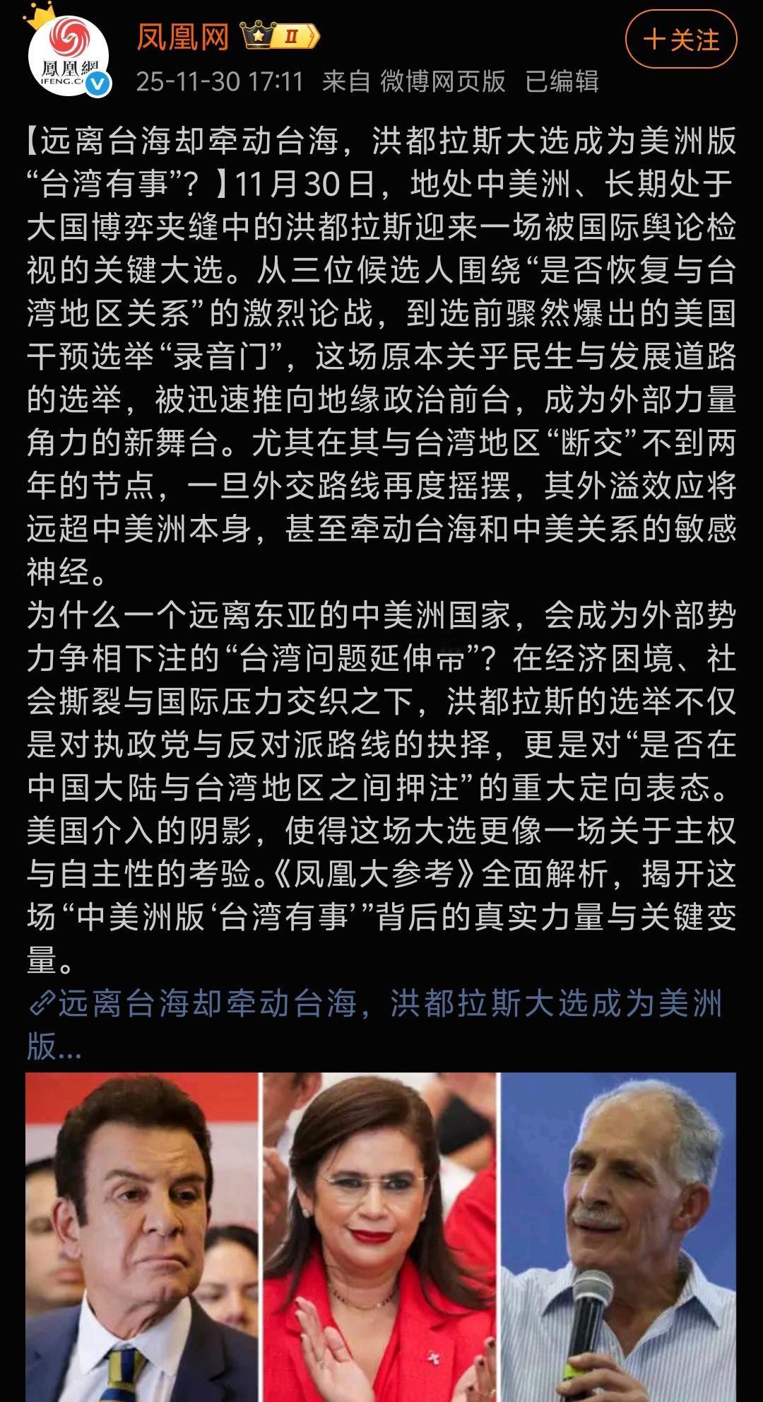 洪都拉斯总统选举结果:右翼候选人纳斯里·阿斯富拉以40.3%的得票率获胜;以微弱优势领先自由党候选人萨尔瓦多·纳斯拉亚的39.5%,执政党候选人蒙卡达仅获19.2%。 美国前总统特朗普公开干预选举,落败方拒绝承认。 洪都拉斯又要转向了吗??