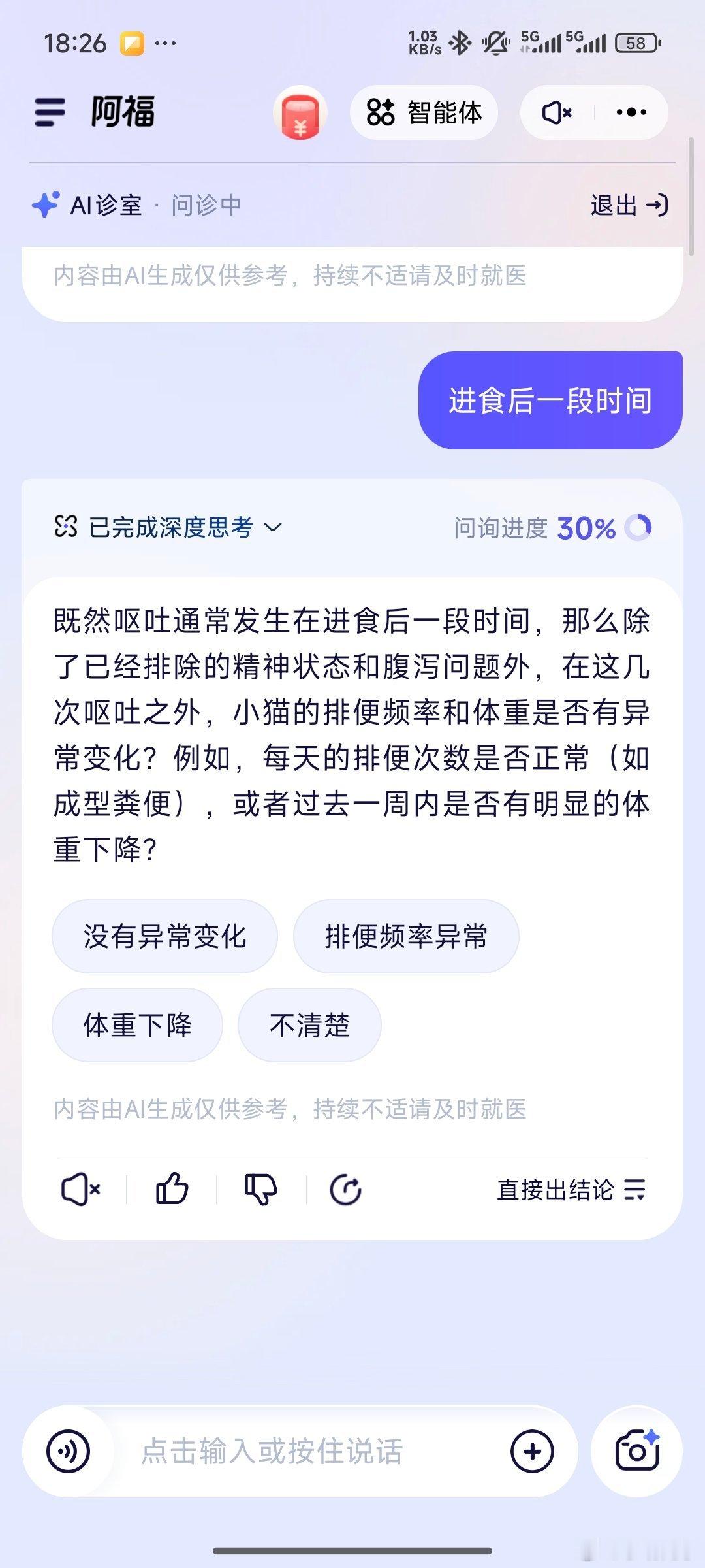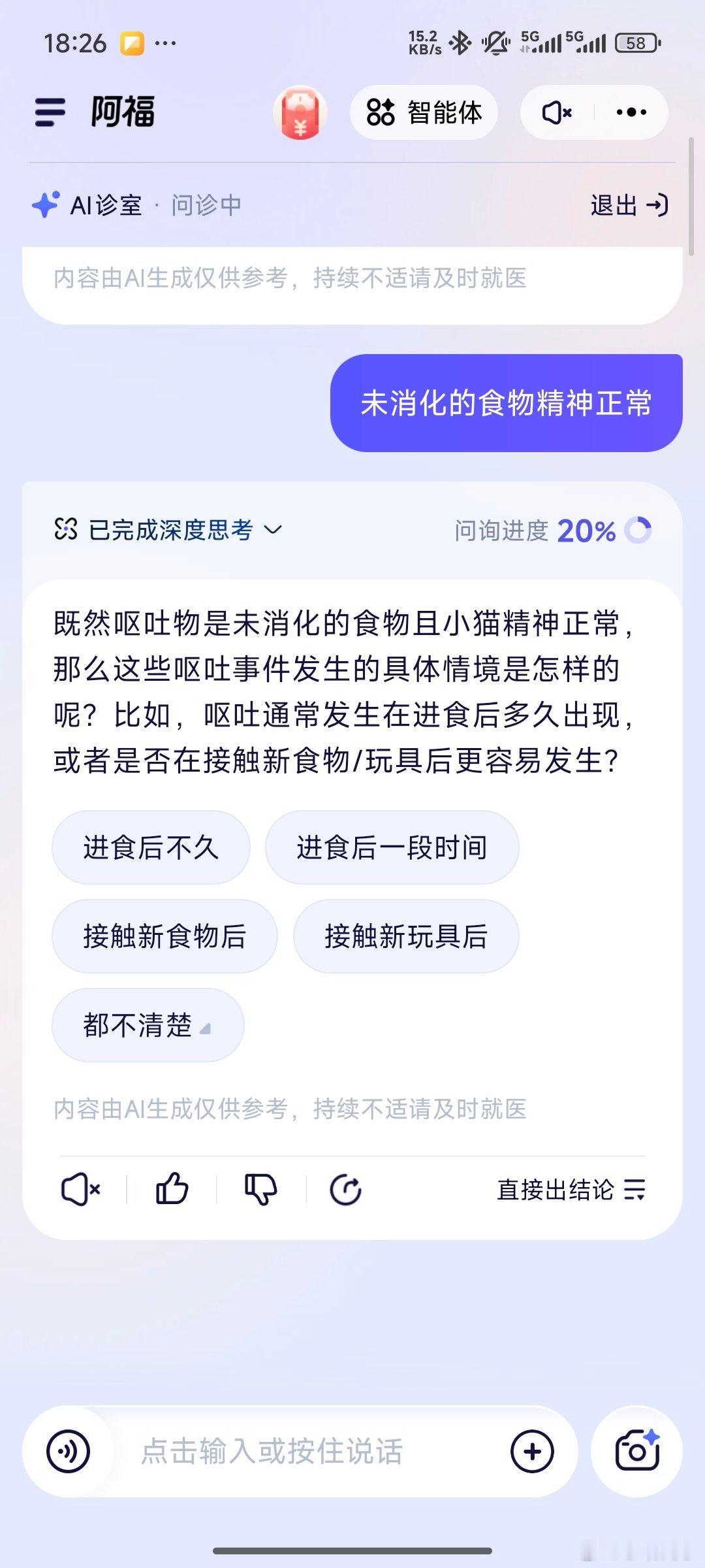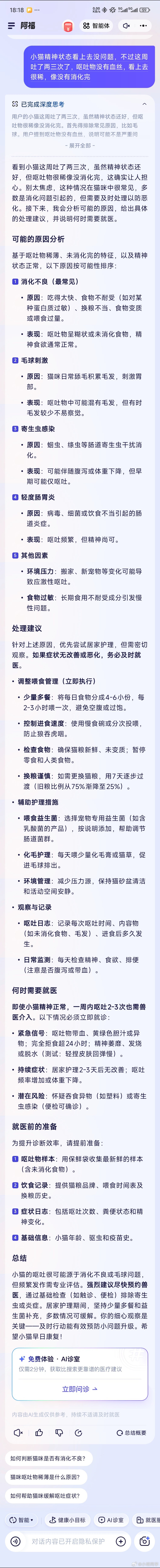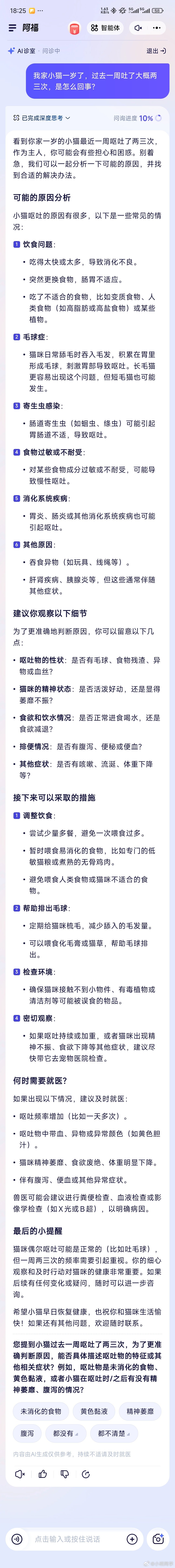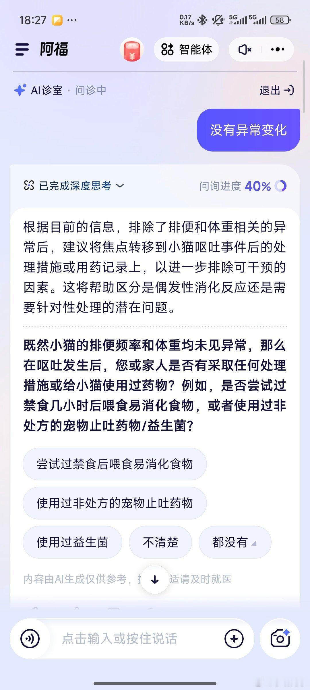 AI救我狗命 在座的各位有没有养宠物的?如果你和我一样养过小猫小狗,相信一定有过因为小家伙的异常状况焦虑万分的情况吧。毕竟宠物的存在在某种意义上已经是我们的家人,可是它即便不舒服也没办法和我们语音沟通,这对于不懂医理的人类简直就是一种折磨,多数人可能都是选择寻求动物医院的帮助,可有时候我们折腾一圈下来发现,都是我们自己的过分担心和焦虑。比如我家的喵星人“糯糯“前段时间就突然出现了呕吐的情况,虽然精神状态没什么变化,可还是不放心。不过我现在的选择不是第一时间带它往医院跑,而是打开蚂蚁阿福,通过AI问诊功能先做一个大致的了解,然后再决定下一步动作。AI大模型进入到细分领域,它的能力也是进一步凸显,像蚂蚁阿福这样的App不只是能提供人类健康陪伴的相关咨询功能,对于宠物它的表现也比我们这些门外汉要专业很多。评论区聊聊,你更希望AI能够提供哪些专业的辅导和帮助呢?