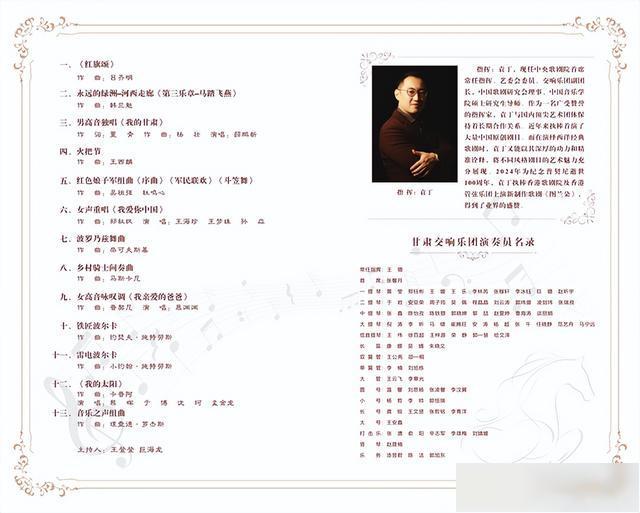 本场音乐会力邀国内著名指挥家袁丁执棒,作为中央歌剧院首席常任指挥、交响乐团副团长、国家“青年拔尖人才”,他将携手甘肃省歌剧院、甘肃交响乐团,将《红旗颂》《红色娘子军组曲》的红色经典旋律,《我的甘肃》《我爱你中国》的深情演唱,《永远的绿洲——河西走廊》原创作品和外国名曲《波罗乃兹舞曲》《雷电波尔卡》等13首国内外经典曲目,以精湛技艺、深邃情感编织新年乐章。在“名团、名家、名曲”的阵容中,展现独特的丝路风情与时代气息。